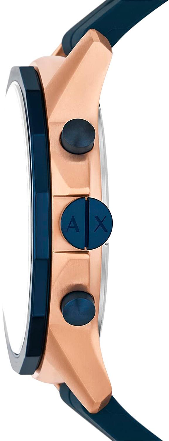 Мужские аналоговые кварцевые часы-хронограф с секундомером. Коллекция Banks. Центральные часовая, минутная и секундная стрелки. Золотистый циферблат с часовыми метками в виде штрихов. Окошко даты в позиции между 4 и 5 часами. 12-ти и 24-х часовой формат отображения времени вынесен на малый циферблат в позиции 3 ч. Круглый корпус из нержавеющей стали с покрытием цвета розового золота, синий безель. Диаметр корпуса 44 мм. Минеральное стекло устойчивое к мелким механическим повреждениям. Переводная головка с защитой. Синий пластиковый ремешок с классической застёжкой buckle. Ширина ремешка 22 мм. Водостойкость WR 50 (мытьё рук, дождь).