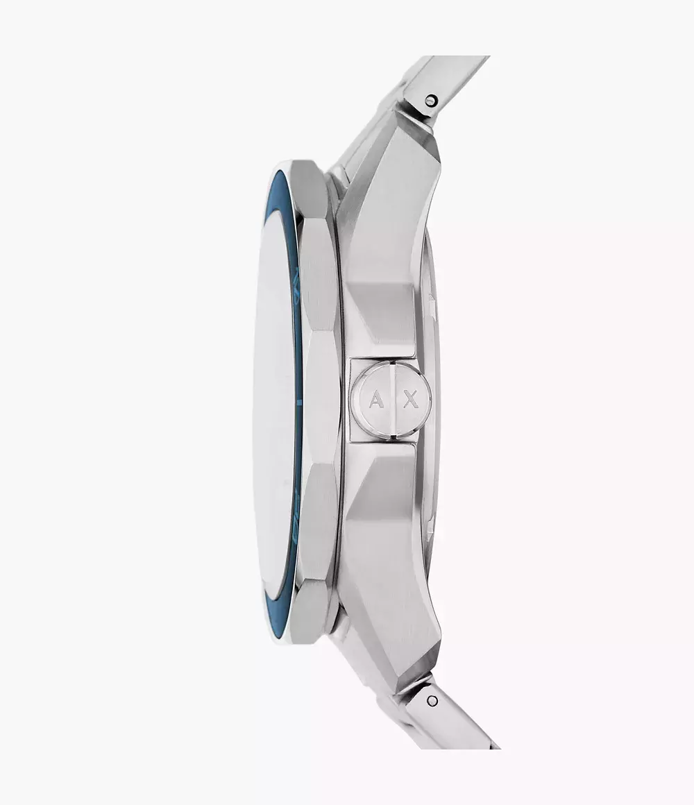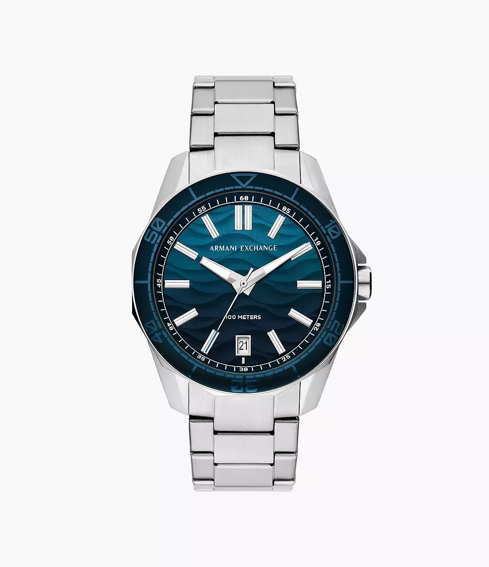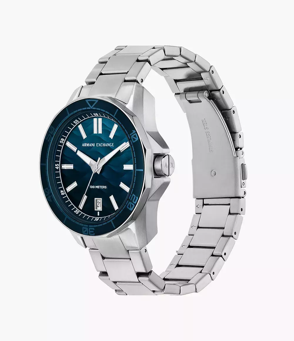 Мужские кварцевые аналоговые часы. Центральные часовая, минутная и секундная стрелки. Окошко даты в позиции 6 ч. Синий циферблат с часовыми метками в виде штрихов. Стрелки и метки с люминесцентным покрытием, которое светится в темноте после непродолжительного нахождения на свету. Круглый корпус из нержавеющей стали. Диаметр корпуса 44 мм, толщина 13 мм. Устойчивое к мелким механическим повреждениям минеральное стекло. Стальной браслет с раскладывающейся застежкой с 2 кнопками. Водостойкость WR 100 (плавание без акваланга).