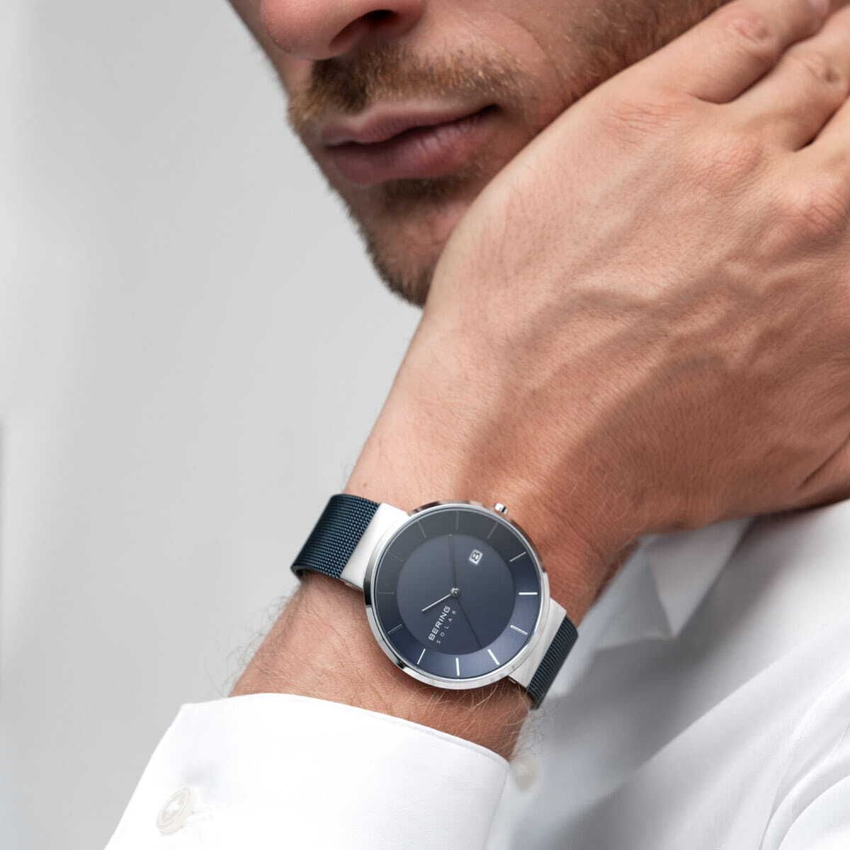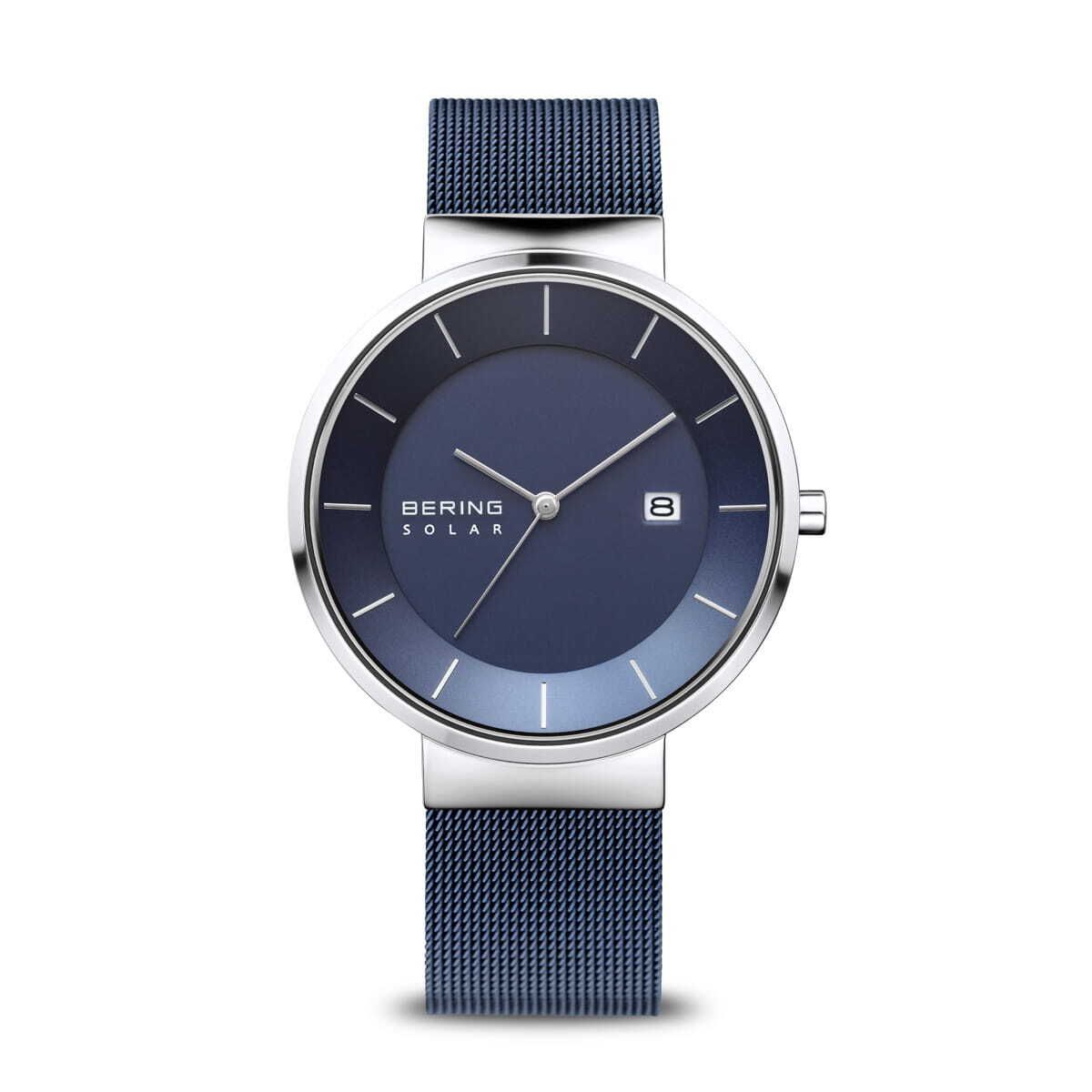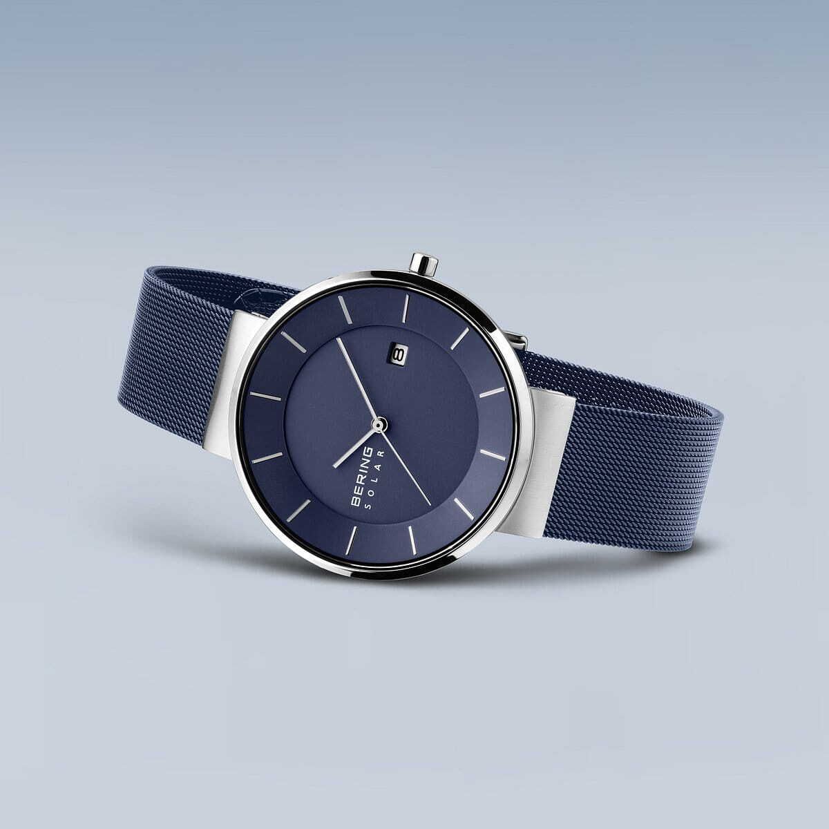 Мужские кварцевые аналоговые наручные часы на солнечной батарее. Коллекция Solar. Питание от солнечной энергии (не нужно менять батарейки) - источником питания служит светочувствительная панель и аккумулятор, заряжаемый при попадании солнечного света на циферблат часов. Запас хода при полностью заряженной батарее от 6 до 12 месяцев. Центральные часовая, минутная и секундная стрелки серебристого цвета. Синий циферблат с часовыми метками в виде серебристых штрихов. Индикация даты в позиции 3 часов. Круглый стальной корпус диаметром 39 мм, толщиной 9 мм. Устойчивое к возникновению мелких царапин плоское сапфировое стекло. Стальной браслет миланского плетения с синим IP покрытием. Ширина браслета 18 мм, длина браслета 205 мм. Раскладывающаяся застежка с фиксатором. Водонепроницаемость WR50 (мытьё рук, дождь).