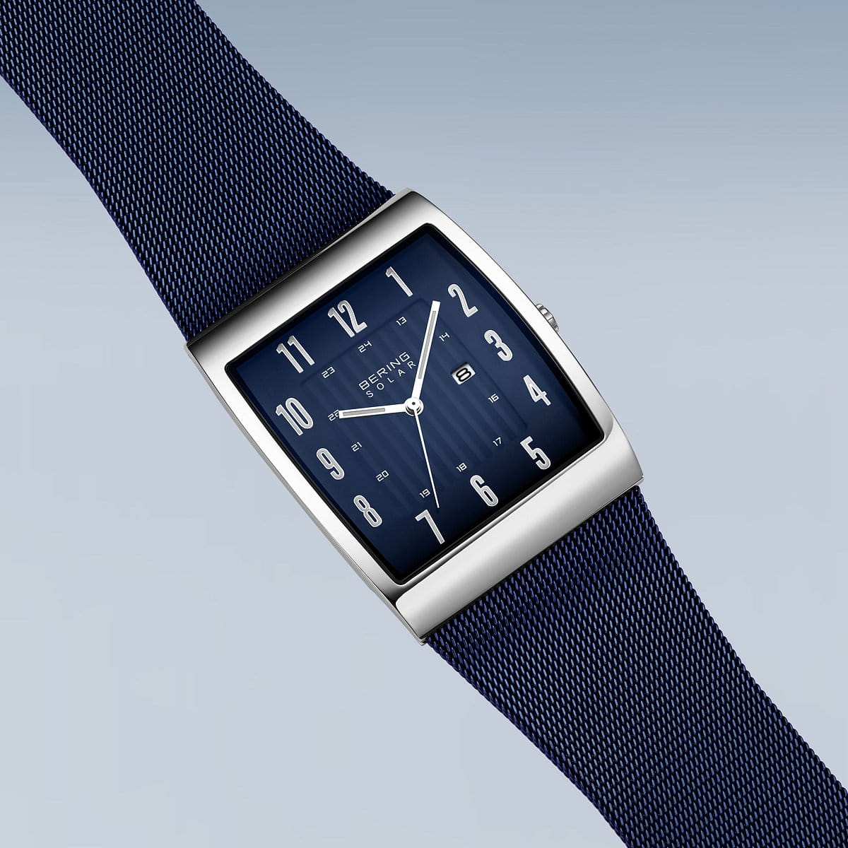 Мужские кварцевые аналоговые наручные часы на солнечной батарее. Коллекция Slim Solar. Механизм Epson VS22B11. Центральные часовая, минутная и секундная стрелки. Синий циферблат с часовыми метками в виде арабских цифр. Стрелки и метки с люминесцентным покрытием, которое светится в темноте после непродолжительного воздействия света. Индикация даты в позиции 3 часов. 24-х часовая шкала на циферблате. Питание от солнечной энергии (не нужно менять батарейки) - источником питания служит светочувствительная панель и аккумулятор, заряжаемый при попадании солнечного света на циферблат часов. Запас хода при полностью заряженной батарее от 6 до 12 месяцев. Прямоугольный стальной корпус. Размер корпуса 33 мм на 44 мм, толщина 8 мм. Устойчивое к возникновению мелких царапин выпуклое сапфировое стекло. Стальной браслет миланского плетения с IP покрытием синего цвета. Ширина браслета 29 мм. Водонепроницаемость WR30 (защита от брызг).