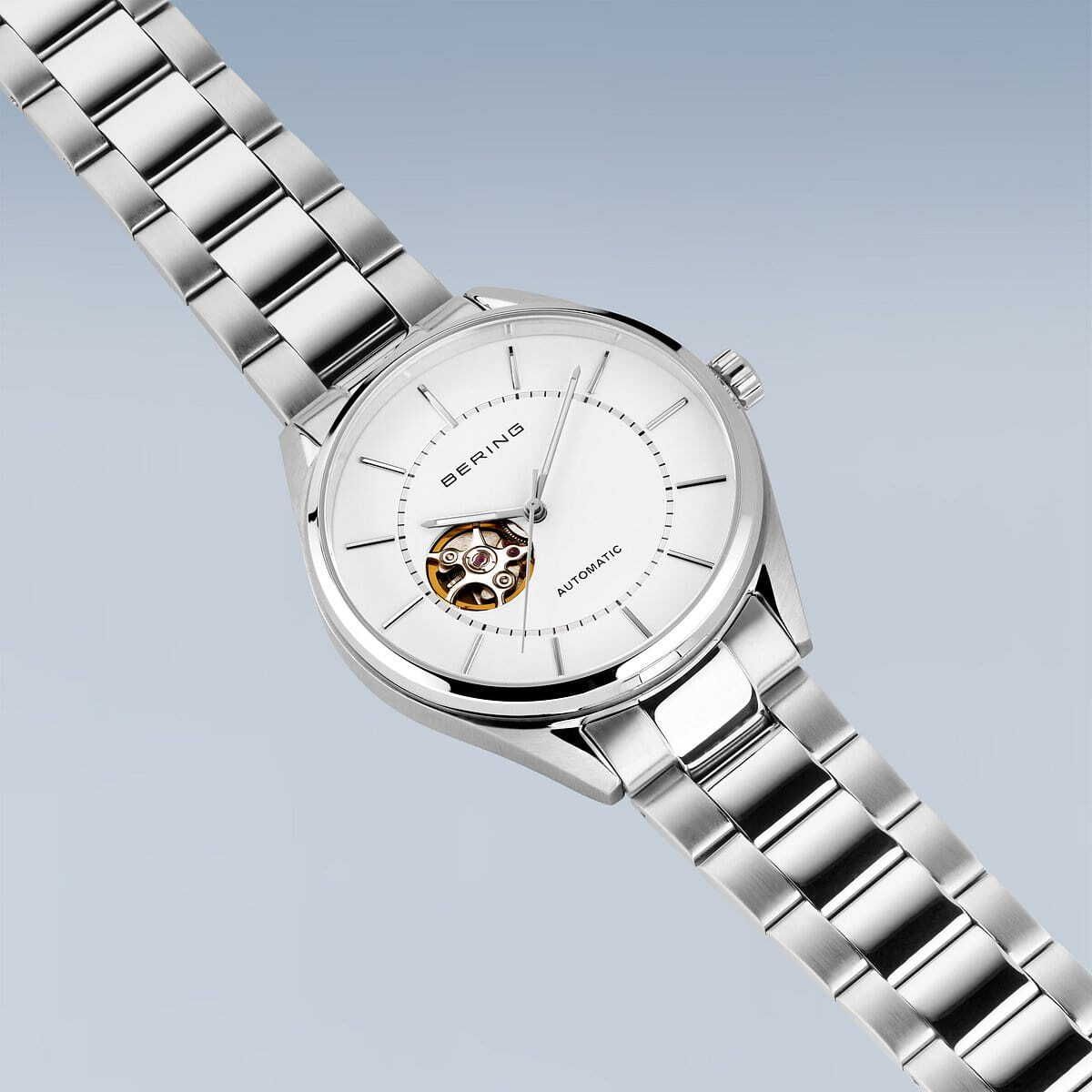 Мужские аналоговые механические часы с автоподзаводом (используется пружинный источник энергии и специальный механизм, который вращается при движении руки и заводит основную пружину автоматически, если носить такие часы каждый день, подводить их вручную не нужно). Коллекция Automatic. Механизм Seiko NH38A. Центральные часовая, минутная и секундная стрелки. Стрелки с люминесцентным покрытием, которое светится в темноте после непродолжительного воздействия света. Белый циферблат с часовыми метками в виде штрихов. Открытый баланс хода (сквозь окошко на циферблате видна работа механизма часов). Круглый стальной корпус диаметром 43 мм, толщиной 12 мм. Устойчивое к возникновению мелких царапин плоское сапфировое стекло. Стальной браслет шириной 20 мм, раскладывающаяся застёжка. Завинчивающаяся прозрачная задняя крышка. Водонепроницаемость WR30 (защита от брызг).