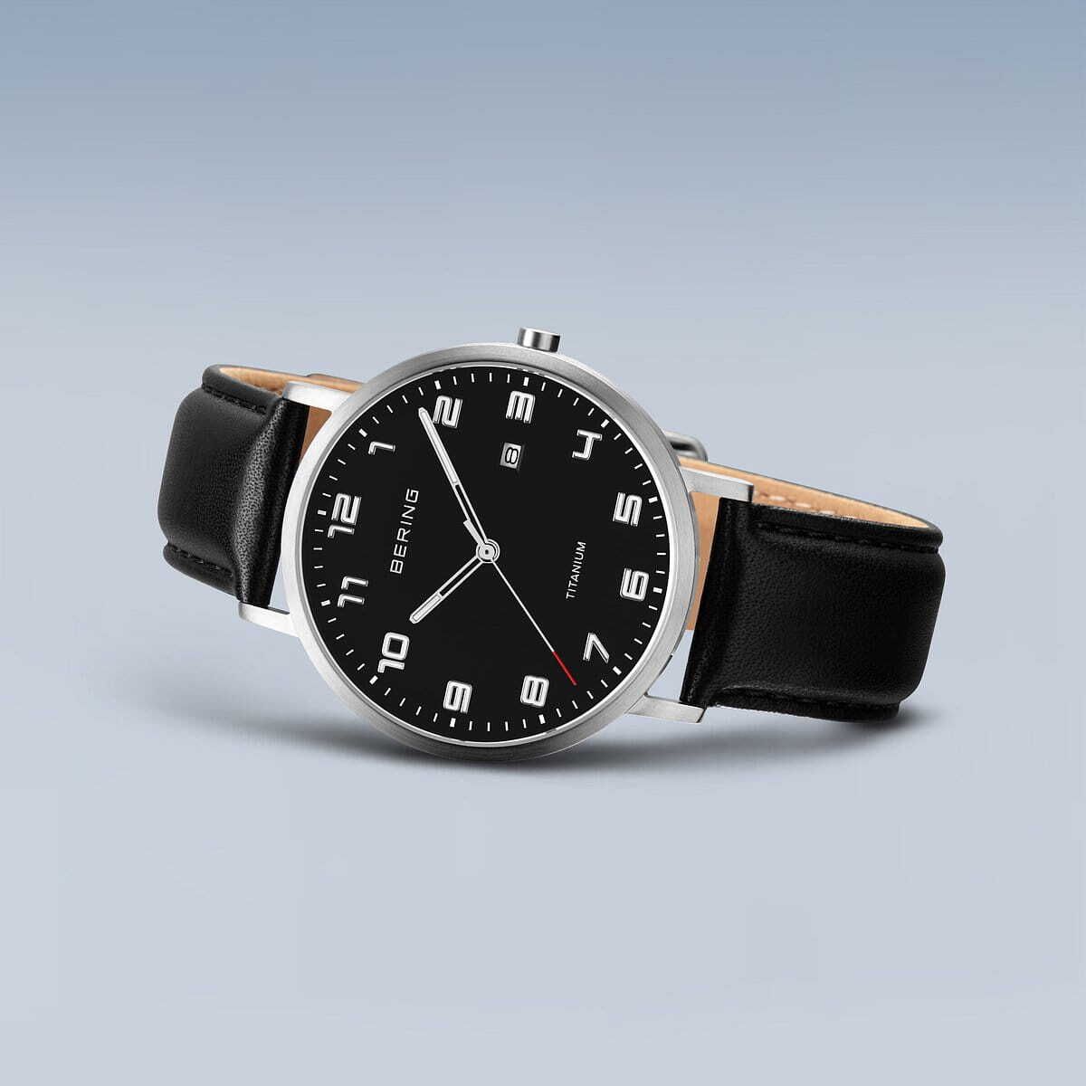 Мужские кварцевые наручные часы с аналоговым отображением времени. Сверхлегкие и элегантные. Коллекция Titanium. Титан сверхлёгкий и гипоаллергенный материал, идеально подходит для повседневного комфорта, даже для чувствительной кожи. Механизм Miyota GM12. Центральные часовая, минутная и секундная стрелки. Стрелки с люминесцентным покрытием, которое светится в темноте после непродолжительного воздействия света. Чёрный циферблат с часовыми метками в виде арабских цифр. Индикация даты в положении 3 часов. Круглый титановый матовый корпус диаметром 40 мм, толщиной 7 мм. Устойчивое к возникновению мелких царапин плоское сапфировое стекло. Чёрный кожаный ремешок с классической застёжкой buckle. Ширина ремешка 20 мм, длина 190 мм. Водонепроницаемость WR50 (мытьё рук, дождь).