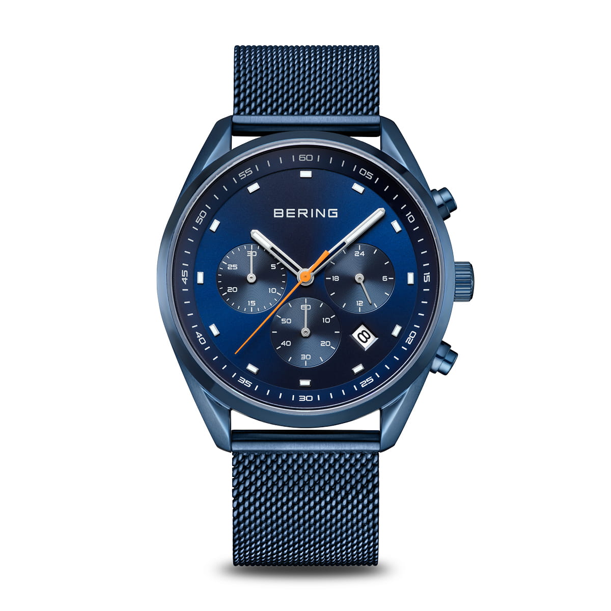 Мужские кварцевые аналоговые наручные часы-хронограф с секундомером. Коллекция Quartz Chrono. Эти часы воплощают в себе суть дизайнерской философии BERING: минимализм, вдохновленный красотой Арктики, воплощенный в жизнь благодаря прочным материалам и функциональной эстетике. Центральные часовая, минутная и секундная стрелки. Стрелки с люминесцентным покрытием, которое светится в темноте после непродолжительного воздействия света. Синий циферблат с часовыми метками в виде штрихов. Индикация даты в позиции между отметками 4 и 5 часов. Секундомер. Стрелочный указатель времени суток - 24-часовая шкала в положении 3 часов. Минутная шкала на циферблате. Круглый стальной корпус с синим IP покрытием. Диаметр корпуса 40 мм, толщина 10 мм. Устойчивое к возникновению мелких царапин плоское сапфировое стекло. Стальной браслет миланского плетения с синим IP покрытием, раскладывающаяся застежка. Ширина браслета 20 мм. Водонепроницаемость WR100 (часы подходят для плавания с маской, трубкой, обычного плавания).