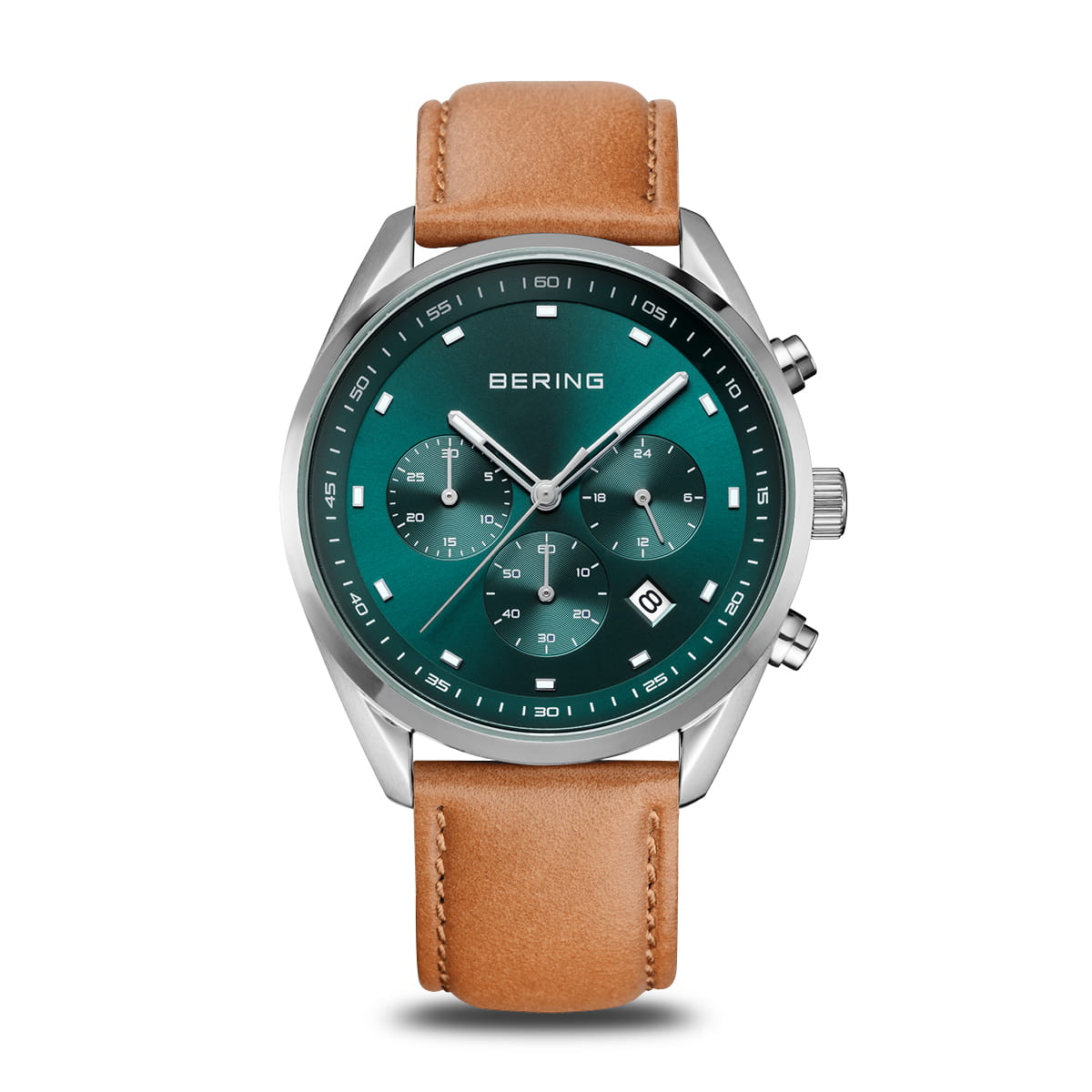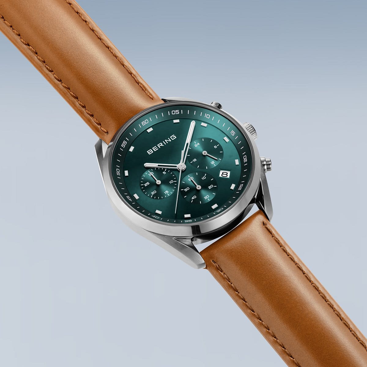 Мужские кварцевые аналоговые наручные часы-хронограф с секундомером. Коллекция Quartz Chrono. Современные и лаконичные –эти часы сочетают в себе скандинавскую элегантность и функциональную точность. Центральные часовая, минутная и секундная стрелки. Стрелки с люминесцентным покрытием, которое светится в темноте после непродолжительного воздействия света. Зелёный циферблат с часовыми метками в виде штрихов. Индикация даты в позиции между отметками 4 и 5 часов. Секундомер. Стрелочный указатель времени суток - 24-часовая шкала в положении 3 часов. Минутная шкала на циферблате. Круглый стальной корпус диаметром 40 мм, толщиной 10 мм. Устойчивое к возникновению мелких царапин плоское сапфировое стекло. Коричневый кожаный ремешок с классической застёжкой buckle. Ширина ремешка 20 мм. Водонепроницаемость WR100 (часы подходят для плавания с маской, трубкой, обычного плавания).