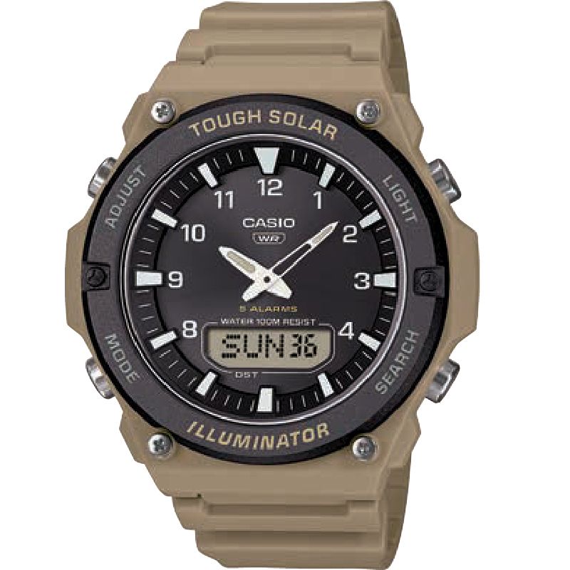 Мужские кварцевые аналого-цифровые наручные часы. Серия Casio Collection Analog-Digital Combination. Питание от солнечной энергии (технология Tough Solar) - источником питания служит светочувствительная панель и аккумулятор, заряжаемый при попадании солнечного света на циферблат часов. Индикатор низкого заряда батареи. Функция автоматического сохранения энергии. Время работы аккумулятора без подзарядки около 10 месяцев, при включенной функции сохранения энергии около 23 месяцев. Центральные часовая и минутная стрелки. Чёрный циферблат с часовыми метками в виде арабских цифр. Стрелки с люминесцентным покрытием, которое светится в темноте после непродолжительного воздействия света. Циферблат подсвечивается светодиодом. Секундомер с точностью показаний 1/100 секунды и временем измерения 1ч. Режимы измерения: отдельные отрезки времени, измерение с разделением, два финишных результата. 2 независимых таймера обратного отсчета от 5с до 100мин с устанавливаемым количеством повторов от 1 до 10. 12-ти и 24-х часовой формат отображения времени. 5 ежедневных будильников, сигнал начала часа. Автоматический календарь до 2099 года, возможность отображения дня недели на шести языках. Функция мирового времени -31 часовая зона (48 городов), всемирное координированное время (UTC), функция включения/отключения летнего времени (DST). Функция выключения звука нажатия кнопок (Mute). Бежевый круглый пластиковый корпус размером 52,5 мм на 50,1 мм, толщиной 12,7 мм. Пластиковое стекло. Бежевый пластиковый ремешок с классической застёжкой buckle. Водонепроницаемость 100WR (часы подходят для плавания с маской, трубкой и обычного плавания). Вес около 46 г.