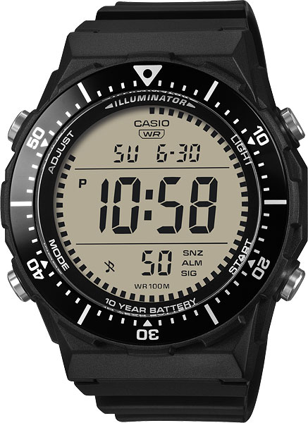 Мужские кварцевые наручные часы с цифровым отображением времени - функциональные часы для спорта, путешествий и отдыха на природе. Крупный корпус, читаемый цифровой дисплей и вращающийся безель подчёркивают спортивный характер часов и делают их удобными в повседневном использовании. Серия Casio Collection Standard Digital. Дисплей подсвечивается светодиодом c функцией послесвечения. Настраиваемое послесвечение 1,5 или 3секунды. 12/24 часовой формат отображения времени. Второй часовой пояс. Включение/выключение летнего времени. Секундомер с точностью показаний 1/100 секунды и временем измерения 24 часа. Режимы измерения: прошедшее время, промежуточное время, два финишных результата. 3 независимых мультифункциональных будильника (ежедневный будильник, будильник по дате, будильник на месяц, ежемесячный будильник), один будильник с функцией повтора сигнала Snooze, ежечасный сигнал. Продолжительность звучания сигнала будильника 10 секунд. Таймер обратного отсчета от 1 минуты до 24 часов с автоповтором. Автоматический календарь до 2099 года. Включение/выключение звука кнопок. Пластиковое стекло. Круглый пластиковый корпус чёрного цвета размером 54,9 мм на 47,3мм, толщиной 14,3мм. Поворотный безель с минутной шкалой. Чёрный пластиковый ремешок с классической застежкой buckle. Батарея рассчитана на 10 лет. Водонепроницаемость 100WR (часы подходят для плавания с маской, трубкой, обычного плавания). Вес около 60 г.