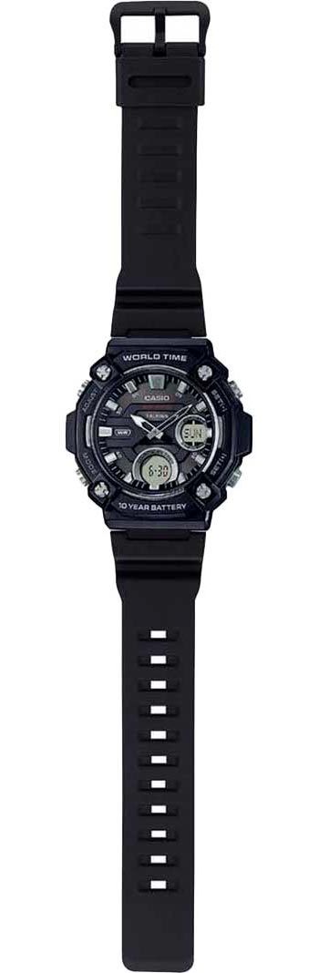Мужские кварцевые аналого-цифровые наручные часы. Серия Casio Collection. Центральные часовая и минутная стрелки. Чёрный циферблат с часовыми метками в виде штрихов. Стрелки и метки с люминесцентным покрытием, которое светится в темноте после непродолжительного воздействия света. Секундомер с точностью показаний 1/100 секунды и временем измерения 24ч. Режимы измерения: прошедшее время, промежуточный результат, два финишных результата. Таймер обратного отсчета от 1 минуты до 24 часов (с интервалами в 1 минуту и 1 час). Записная книжка на 30 ячеек памяти для записи имен и телефонных номеров, каждая запись может включать в себя текст из 8 букв и 16 цифр; отображение количества свободных записей, автоматическая сортировка записей. 12-ти и 24-х часовой формат отображения времени. 3 ежедневных независимых будильника, 1 будильник с повтором сигнала, сигнал начала часа. Автоматический календарь до 2099 года. Функция мирового времени -29 часовых зон (30 городов), включение/отключение летнего времени. Круглый пластиковый корпус чёрного цвета. Размер корпуса 52,2 мм на 53,3мм, толщина 16,8мм. Пластиковое стекло. Чёрный пластиковый ремешок с классической застежкой buckle. Батарея рассчитана на 10 лет. Водонепроницаемость WR100 (часы подходят для плавания с маской, трубкой и обычного плавания). Вес около 58 г.