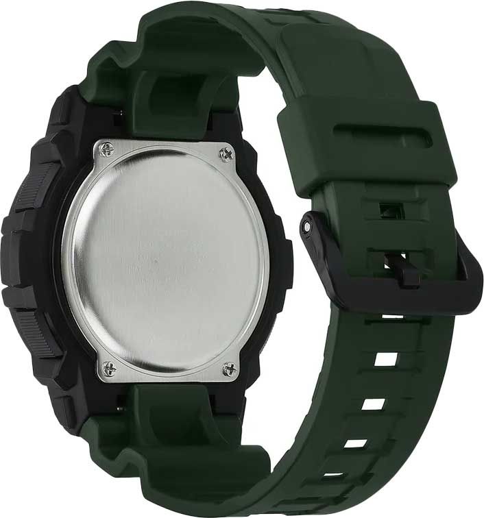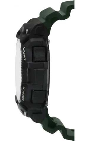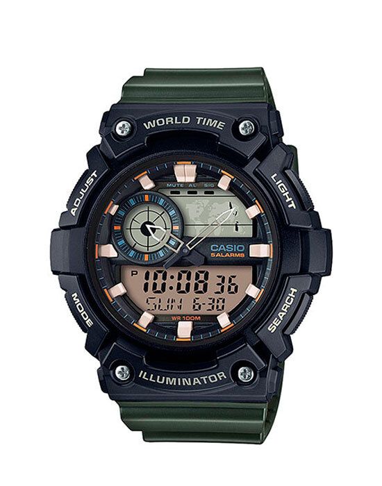 Мужские кварцевые наручные часы с аналого-цифровым отображением времени. Коллекция Standard Analog-Digital. Циферблат подсвечивается светодиодом, настройка продолжительности подсветки 1.5 или 3 секунды. Мировое время - 48 городов (31 часовой пояс), всемирное координированное время (UTC), возможность включения/отключения летнего времени, Переключение между домашним и мировым временем. 12-ти и 24-х часовой формат отображения времени. Секундомер с точностью показаний 1/100 с и временем измерения 24ч. Режимы измерения: прошедшее время, промежуточное время, два финишных результата. Таймер обратного отсчета от 1с до 24ч (с интервалами 1 с, 1 мин и 1 час). 5 будильников (одноразовых или ежедневных); сигнал начала часа. Функция включения/отключения звука кнопок. Автоматический календарь до 2099 года. Отображение двойного времени - цифровой циферблат в верхнем левом углу отображает домашнее время, схематическая карта мира на LCD- дисплее в правом верхнем углу отображает выбранный часовой пояс. Круглый корпус из полимерного пластика чёрного цвета. Размер корпуса 51,4 мм на 53,7мм, толщина 16,4мм. Пластиковое стекло. Люминесцентный состав на стрелках и часовых метках с ярким послесвечением даже после кратковременного воздействия света. Зелёный пластиковый ремешок с классической застёжкой buckle. Батарейка рассчитана на 5 лет. Водонепроницаемость WR100 (часы подходят для плавания с маской, трубкой и обычного плавания). Вес около 54 г.