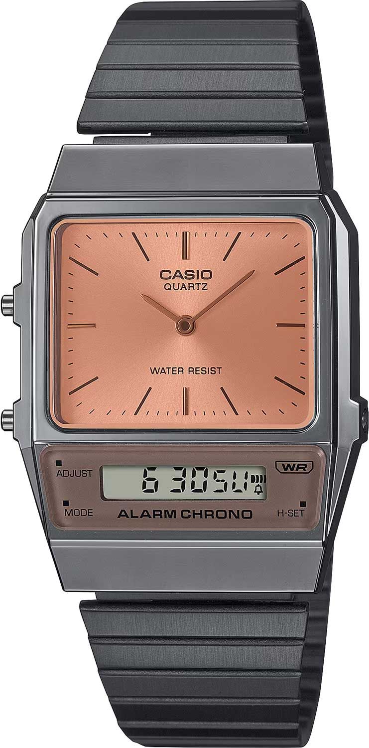 Мужские кварцевые наручные часы. Коллекция Vintage. 12-ти и 24-х часовой формат отображения времени. Секундомер с точностью показаний 1/100 с. и временем измерения 1 час. Одновременное отображение времени двух часовых поясов. Будильник. Квадратный корпус выполнен из пластика. Стальной браслет.
