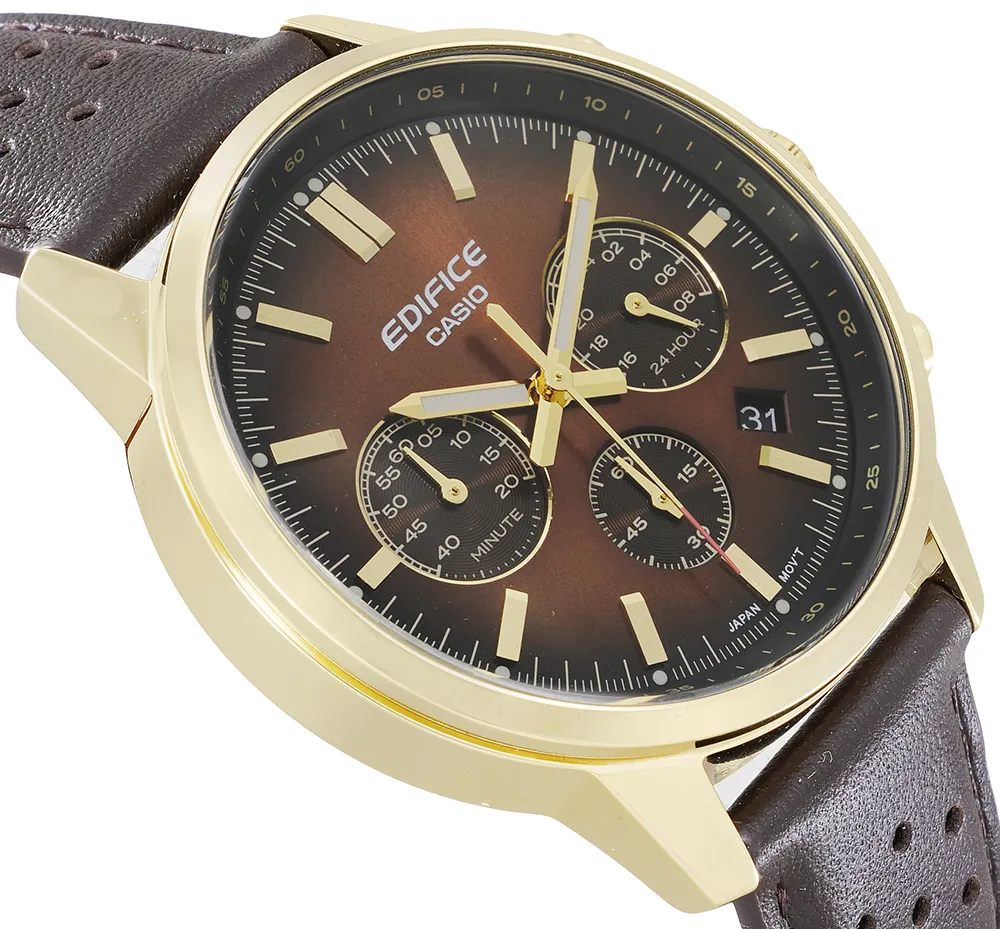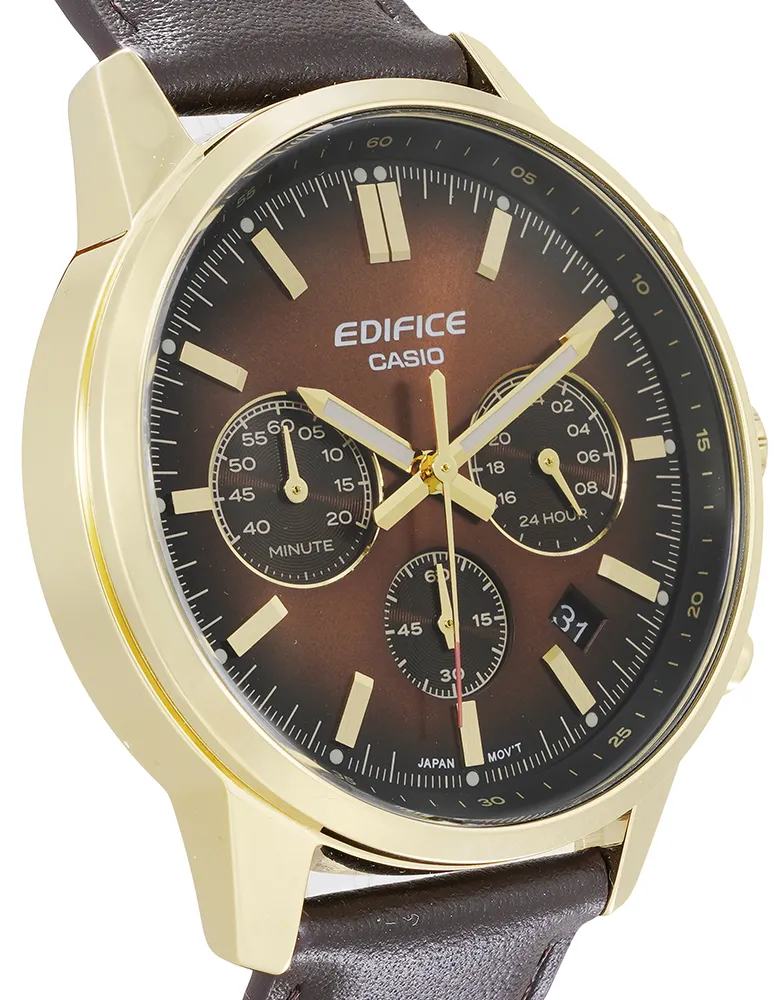 Мужские кварцевые наручные часы с аналоговым отображением времени (стрелочные). Серия Casio Beside Line. Элегантность и изысканность - классические часы с сапфировым стеклом в компактном стальном корпусе на кожаном ремешке. Простые и лаконичные часы как для деловых встреч, так и для официальных мероприятий. Центральные часовая, минутная и секундная стрелки золотистого цвета. Стрелочный указатель времени суток с 24-х часовой шкалой вынесен на дополнительный малый циферблат в позиции 6 часов. Бежевый циферблат с часовыми метками в виде золотистых штрихов и четырёх римских цифр. Устойчивое к возникновению мелких царапин сапфировое стекло. Круглый стальной корпус размером 40 мм на 47.5 мм, толщиной 9,1 мм. Рифлёная переводная головка. Коричневый кожаный ремешок с классической застёжкой buckle. Батарейка рассчитана на 3 года. Водонепроницаемость 50WR (мытьё рук, дождь). Вес около 55 г.
