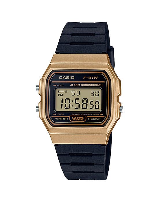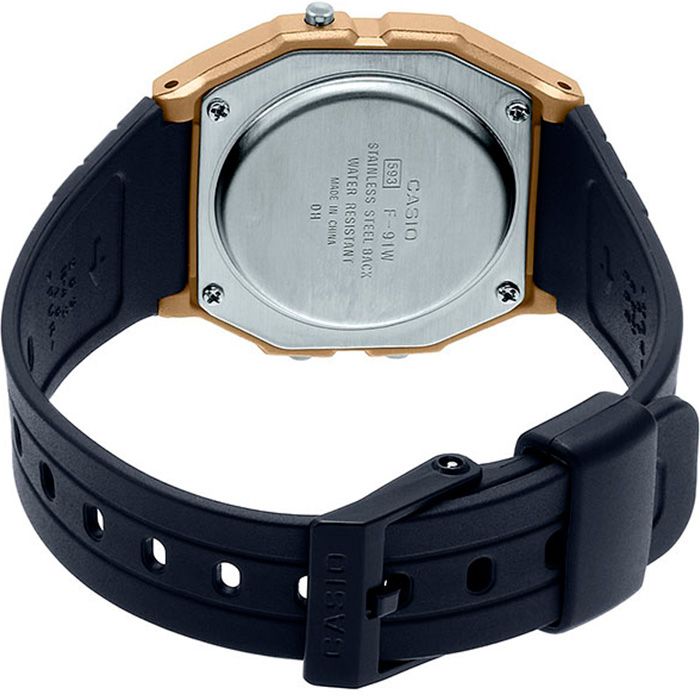 Кварцевые электронные наручные часы. Серия Casio Collection. Унисекс часы. Дисплей подсвечивается светодиодом. 12-ти и 24-х часовой формат отображения времени. Секундомер с точностью показаний 1/100 с и временем измерения 1ч. Режимы измерения: прошедшее время, промежуточное время, два финишных результата. Ежедневный будильник, ежечасный сигнал. Автоматический календарь с установкой 28 дней на февраль. Прямоугольный пластиковый корпус золотистого цвета. Размеры корпуса 38,2мм на 35,2 мм, толщина 8.5 мм. Пластиковое стекло. Чёрный пластиковый ремешок с классической застежкой buckle. Срок службы батареи около 7 лет. Стальная задняя крышка крепится на 4-х винтах. Водонепроницаемость WR30 (защита от брызг). Вес около 21 г.