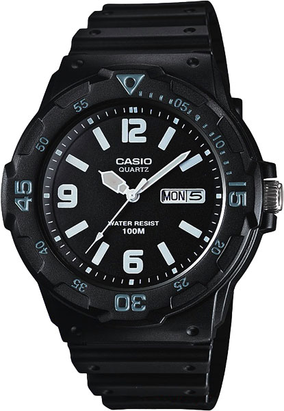 Мужские кварцевые наручные часы с аналоговым отображением времени. Серия Casio Collection. Часы в спортивном стиле для активного отдыха и повседневного использования. Центральные часовая, минутная и секундная стрелки. Чёрный циферблат с часовыми метками в виде штрихов и трёх арабских цифр 12, 6 и 9. Стрелки и часовые метки с люминесцентным покрытием, которое светится в темноте после непродолжительного воздействия света. Индикация даты и дня недели в позиции 3 часов (значение даты меняется до 31, для месяцев, у которых количество дней меньше 31, необходимо корректировать значение вручную). Пластиковое стекло. Круглый корпус из полимерного пластика чёрного цвета. Размеры корпуса 44,6 мм на 47,9мм, толщина 11,6мм. Вращающийся безель с минутной шкалой. Переводная головка с защитой. Чёрный пластиковый ремешок с классической застёжкой buckle. Батарейка рассчитана на 3 года. Водонепроницаемость 100WR (часы подходят для плавания с маской, трубкой, обычного плавания). Вес около 39 г.