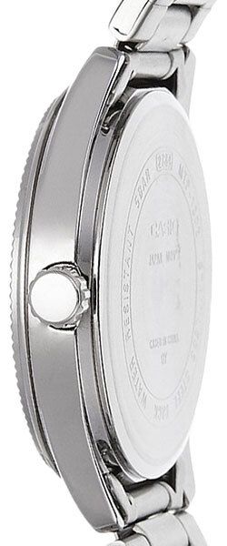 Мужские кварцевые аналоговые наручные часы. Центральные часовая, минутная и секундная стрелки. Синий циферблат с часовыми метками в виде штрихов. Стрелки и метки с люминесцентным покрытием, которое светится в темноте после непродолжительного воздействия света. Окошко с датой в положении 3 ч. Значение даты меняется до 31. Для месяцев, у которых количество дней меньше 31, необходимо корректировать значение вручную. Устойчивое к мелким механическим повреждениям минеральное стекло. Минутная шкала на циферблате. Рифлёный безель. Стальной браслет с раскладывающейся застёжкой. Батарея рассчитана на 3 года. Водонепроницаемость 50WR (мытьё рук, дождь). Вес около 105 г.