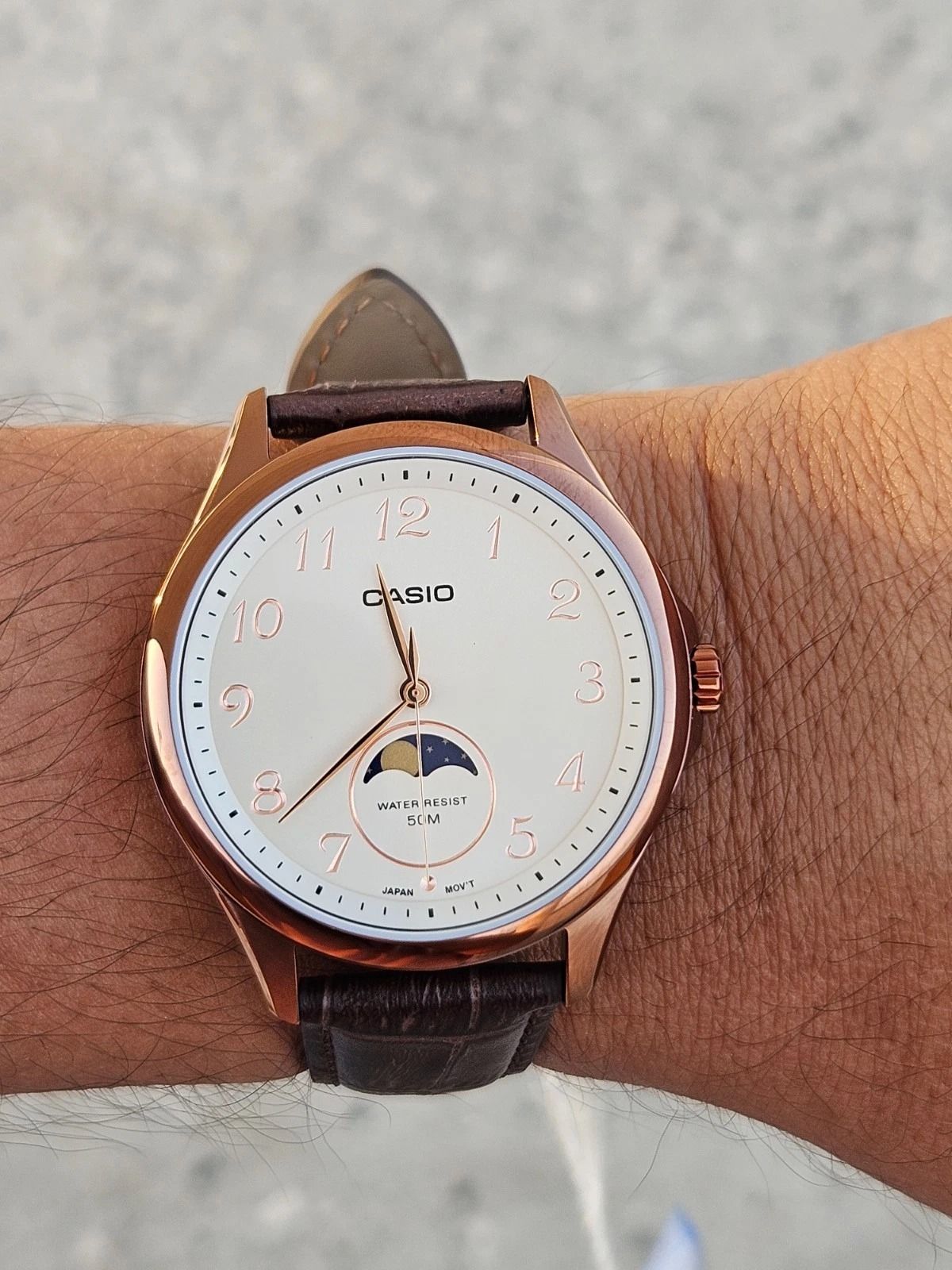 Мужские кварцевые наручные часы с аналоговым отображением времени. Серия Standard Analog Collection. Центральные часовая, минутная и секундная стрелки золотистого цвета. Бежевый циферблат с часовыми метками в виде арабских цифр золотистого цвета. Индикатор фаз Луны (дополнительный циферблат с изображением фаз Луны и градуировкой на 29,5 суток (продолжительность лунного месяца), показывает, как выглядит Луна (светлая часть индикатора) в полдень в Северном полушарии) находится в положении 6 часов. Устойчивое к мелким механическим повреждениям минеральное стекло. Круглый стальной корпус с IP покрытием цвета розового золота. Размер корпуса 42,5 мм на 48,4мм, толщина 9,6 мм. Переводная головка с защитой. Коричневыц кожаный ремешок с классической застёжкой buckle. Задняя крышка с винтовым фиксатором. Батарея рассчитана на 3 года. Водонепроницаемость 50WR (мытьё рук, дождь). Вес около 58 г.