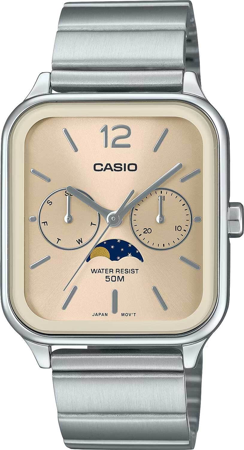 Мужские кварцевые аналоговые наручные часы. Центральные часовая, минутная и секундная стрелки. Бежевый циферблат с часовыми метками в виде штрихов и арабской цифры 12. Стрелочный указатель даты вынесен на дополнительный малый циферблат в позиции 3 ч. Стрелочный указатель дня недели вынесен на дополнительный малый циферблат в позиции 9 ч. Фазы Луны в позиции 6 ч. Устойчивое к мелким механическим повреждениям минеральное стекло. Прямоугольный стальной корпус. Размеры корпуса 34 мм на 44,5 мм, толщина 9,3 мм. Стальной браслет с тройной раскладывающейся застежкой. Батарейка рассчитана на 3 года. Водозащищенность 50WR (мытьё рук, дождь). Вес около 116 г