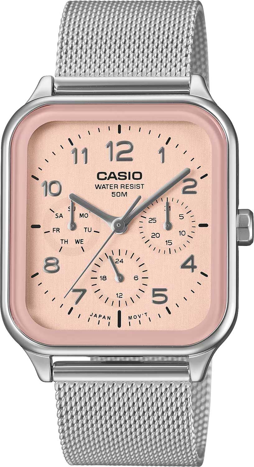 Мужские кварцевые наручные часы с аналоговым отображением времени. Серия Casio Collection. Центральные часовая, минутная и секундная стрелки серебристого цвета. Розовый циферблат с часовыми метками в виде арабских цифр и штрихов. Малые циферблаты с указанием числа (в положении 3 часов), дня недели (в положении 9 часов) и суточного времени (в положении 6 часов). Устойчивое к мелким механическим повреждениям минеральное стекло. Прямоугольный стальной корпус размером 34 мм на 44,5 мм, толщиной 9,4 мм. Стальной браслет миланского плетения с регулируемой застежкой. Батарейка рассчитана на 2 года. Водонепроницаемость 50WR (мытьё рук, дождь). Вес около 117 г.