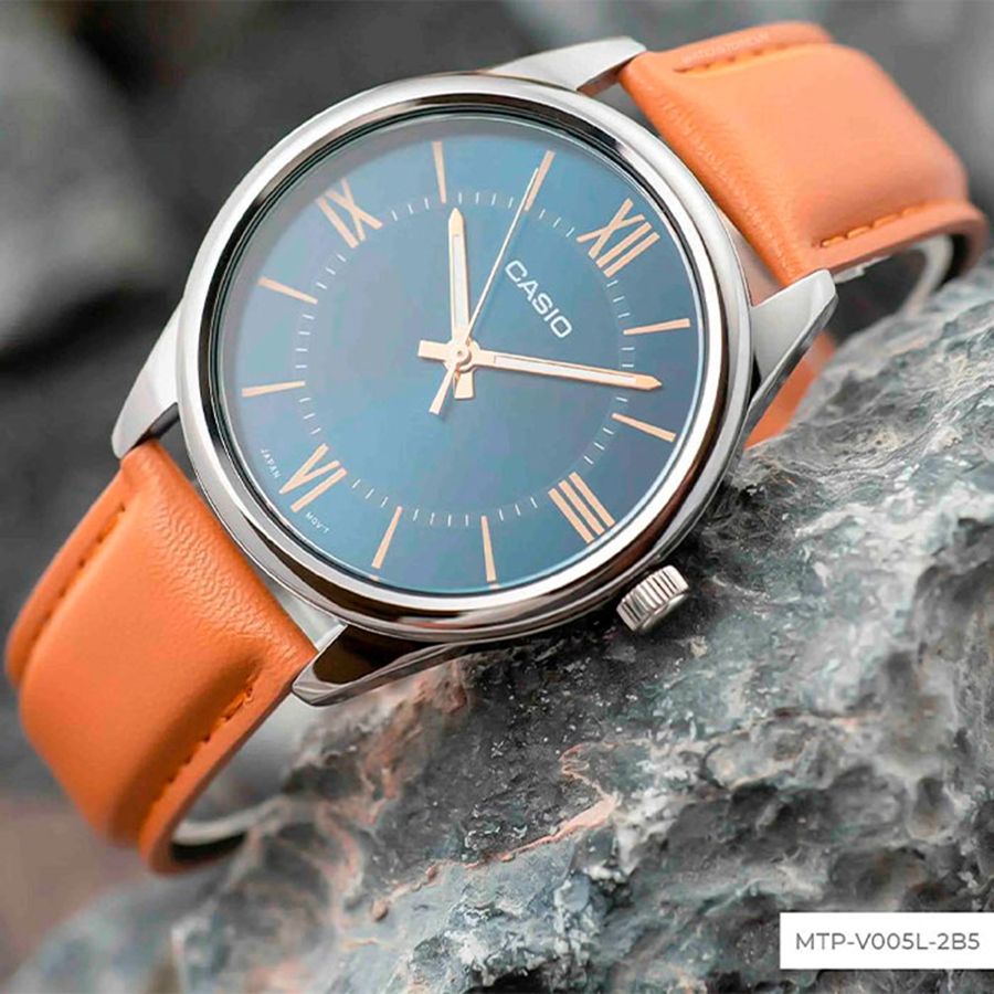 Мужские кварцевые аналоговые наручные часы. Серия Casio Collection. Центральные часовая, минутная и секундная стрелки. Синий циферблат с часовыми метками в виде штрихов и четырёх римских цифр. Стрелки с люминесцентным покрытием, которое светится в темноте после непродолжительного воздействия света. Устойчивое к мелким механическим повреждениям минеральное стекло. Круглый корпус серебристого цвета. Размер корпуса 40 мм на 47 мм, толщина 8.1 мм. Рифлёная переводная головка в позиции 3 ч. Коричневый кожаный ремешок с классической застежкой buckle. Батарейка рассчитана на 3 года. Водонепроницаемость 30WR (защита от брызг). Вес около 46 г.