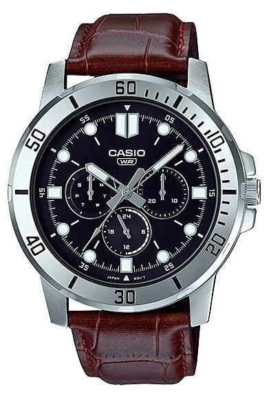 Мужские кварцевые аналоговые наручные часы. Серия Casio Collection . Центральная секундная стрелка. 12-ти и 24-х часовой формат времени, число и день недели вынесены на отдельные циферблаты. Светящееся покрытие стрелок обеспечивает длительную подсветку в темное время суток после короткого воздействия света. Круглый стальной корпус. Кожаный ремешок.
