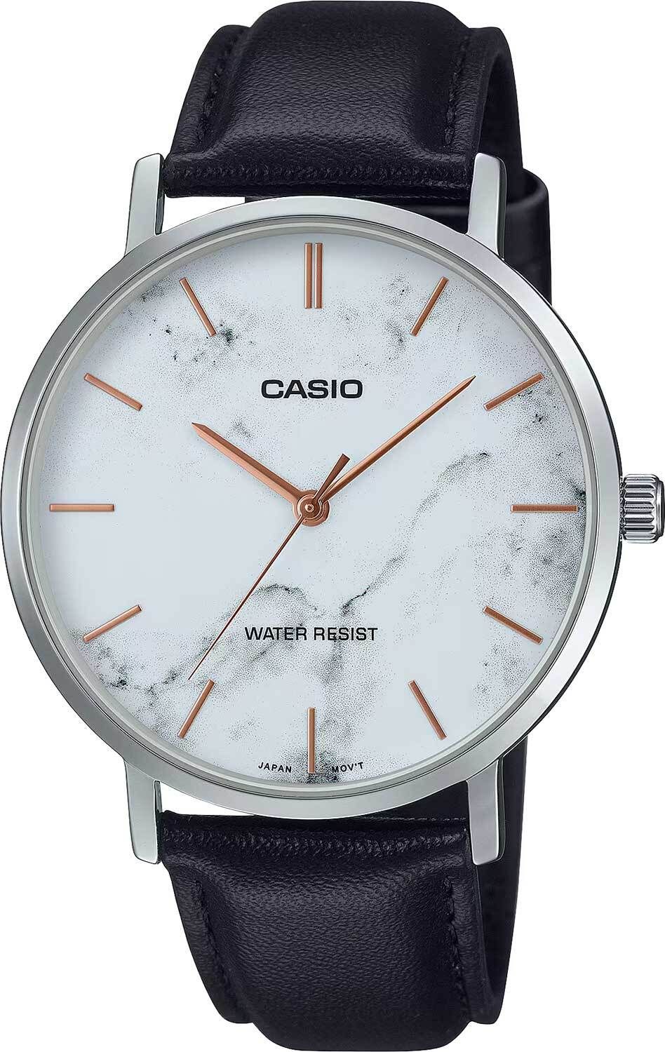 Мужские кварцевые аналоговые наручные часы. Серия Casio Collection. Центральные часовая, минутная и секундная стрелки. Белый циферблат с часовыми метками в виде штрихов. Круглый стальной корпус размером 40 мм на 46мм, толщиной 8,2мм Устойчивое к мелким механическим повреждениям минеральное стекло. Рифлёная переводная головка. Чёрный кожаный ремешок с классической застёжкой buckle. Батарея рассчитана на 3 года. Водонепроницаемость 30WR (брызги). Вес около 41 г.
