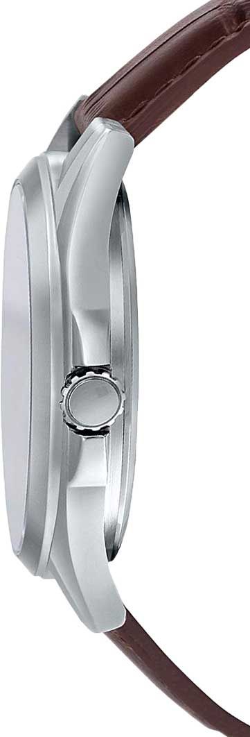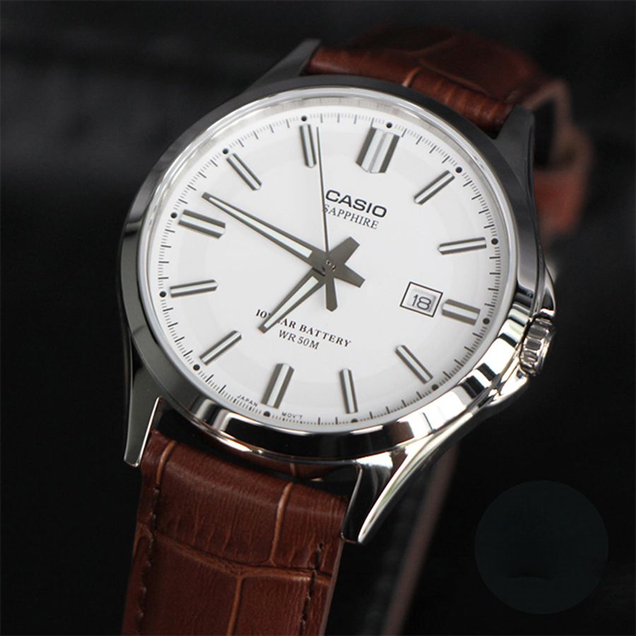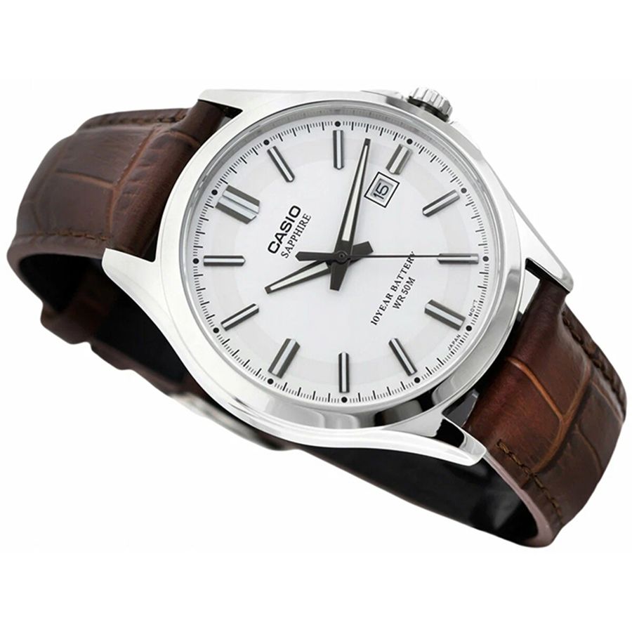 Мужские кварцевые аналоговые наручные часы. Серия Casio Collection. Центральные часовая, минутная и секундная стрелки. Белый циферблат с часовыми метками в виде штрихов. Стрелки и метки с люминесцентным покрытием, которое светится в темноте после непродолжительного воздействия света. Окошко даты в положении 3 ч. Устойчивое к возникновению мелких царапин сапфировое стекло. Круглый стальной корпус размером 41.3 мм на 47 мм, толщиной 8.8 мм. Рифлёная переводная головка с защитой. Коричневый кожаный ремешок с классической застежкой buckle. Батарейка рассчитана на 10 лет. Водонепроницаемость 50WR (мытьё рук, дождь). Вес около 54 г.