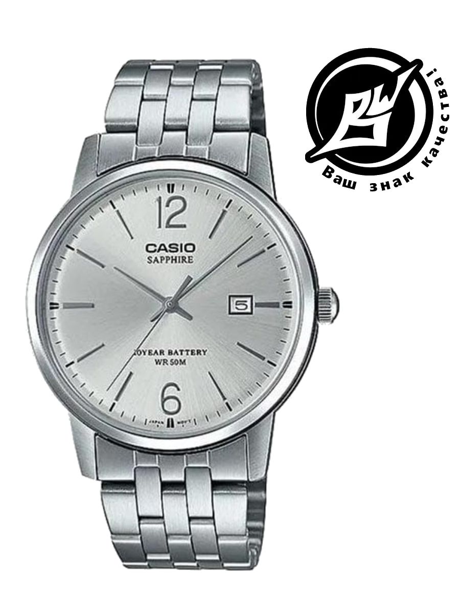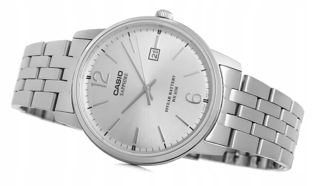 Мужские кварцевые часы с аналоговым отображением времени (стрелочные) для повседневного ношения. Серия Casio Collection. Центральные часовая, минутная и секундная стрелки серебристого цвета. Серебристый циферблат с часовыми метками в виде штрихов и двух арабских цифр 6 и 12. Индикация даты в позиции 3 часов (значение даты меняется до 31, для месяцев, у которых количество дней меньше 31, необходимо корректировать значение вручную). Устойчивое к возникновению мелких царапин сапфировое стекло. Круглый стальной корпус размером 46 мм на 38,8 мм, толщиной 8,8 мм. Рифлёная переводная головка. Стальной браслет с тройной раскладывающейся застежкой. Ширина браслета 20 мм. Батарейка рассчитана на 10 лет. Водонепроницаемость 50WR (мытьё рук, дождь). Вес около 106 г.