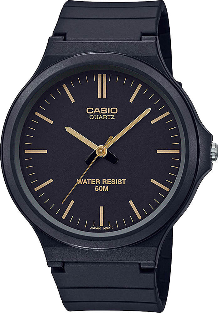 Мужские кварцевые аналоговые наручные часы. Серия Casio Collection. Центральные часовая минутная и секундная стрелки золотистого цвета. Чёрный циферблат с часовыми метками в виде штрихов золотистого цвета. Переводная головка с защитой. Пластиковое стекло. Круглый корпус из полимерного пластика чёрного цвета. Размеры корпуса 43,6 мм на 48 мм. Толщина 10,3. Чёрный пластиковый ремешок с классической застёжкой buckle. Ширина ремешка 22 мм. Батарея рассчитана на 3 года. Водонепроницаемость 50WR (мытьё рук, дождь). Вес около 35 г.