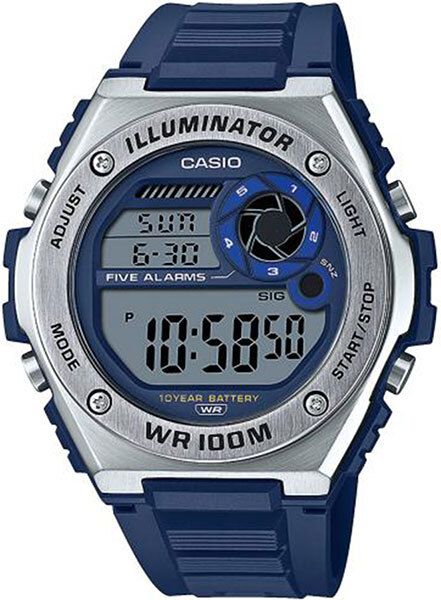Мужские кварцевые наручные часы с цифровым отображением времени. Серия Casio Collection Standard Digital. Часы с секундомером и таймером станут незаменимым помощником при занятиях спортом. Циферблат подсвечивается светодиодом с функцией послесвечения. Цвет подсветки оранжевый. Двойное время (Dual Time) - одновременное отображение текущего времени в двух разных часовых поясах. Автоматический календарь до 2099 года. Секундомер с точностью показаний 1/100 секунды и временем измерения 24 часа. Режимы измерения: прошедшее время, промежуточное время, два финишных результата. Таймер обратного отсчета от 1минуты до 24часов с автоповтором. 12/24 -х часовой формат отображения времени. 5 ежедневных будильников, 1 с функцией повтора сигнала Snooze, ежечасный сигнал. Типы будильников: ежедневный; будильник, настроенный на определенный день; будильник, настроенный на ежедневное звучание в течение месяца; ежемесячный будильник Продолжительность звучания сигнала будильника 10 секунд. Круглый корпус из нержавеющей стали и синего пластика. Размеры корпуса 50,7 мм на 51,8мм, толщина 13,7мм. Синий пластиковый ремешок с классической застёжкой buckle. Батарея рассчитана на 10 лет. Водонепроницаемость 100WR (часы подходят для плавания с маской, трубкой, обычного плавания). Вес около 55 г.