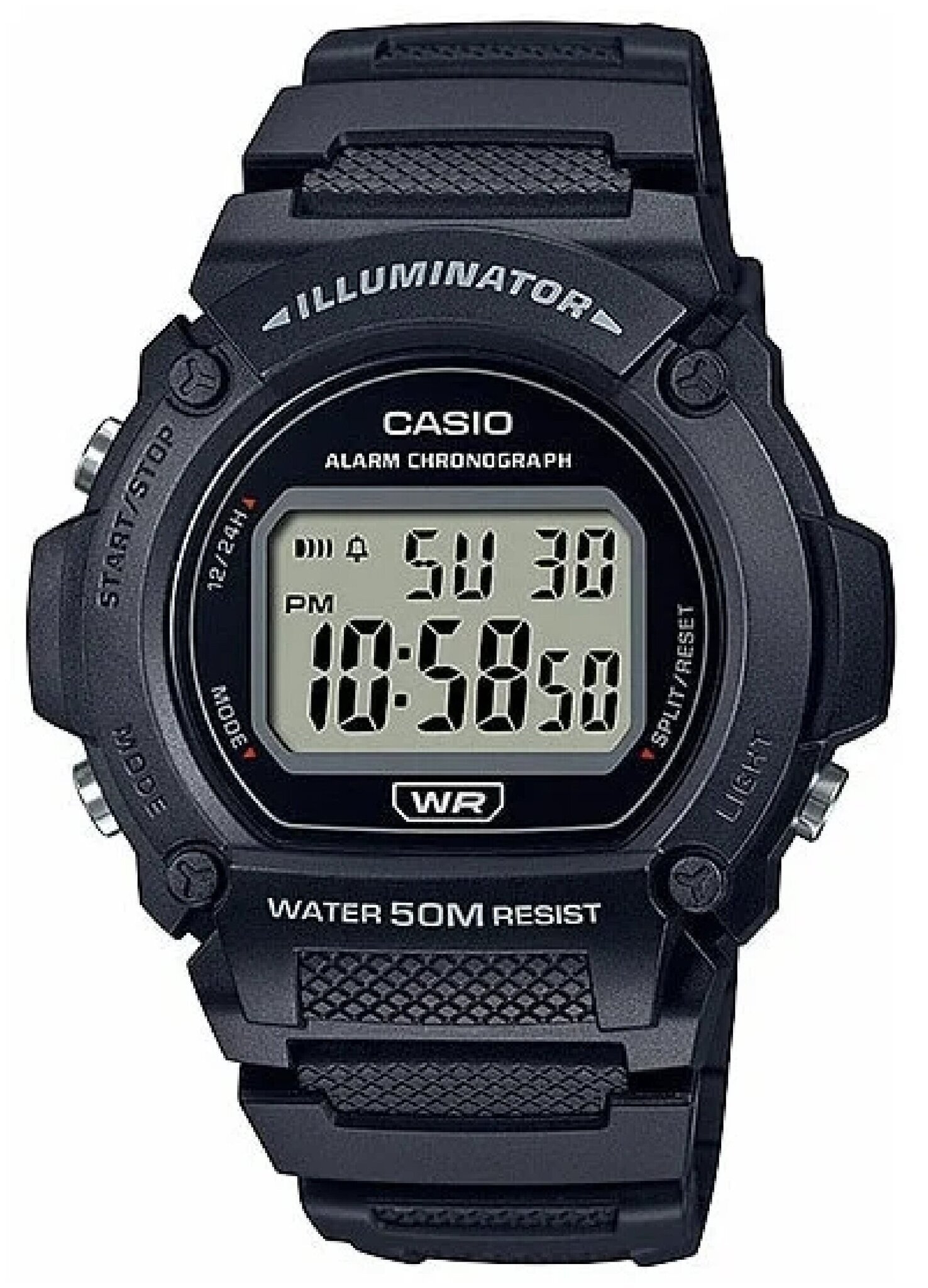 Мужские электронные наручные часы со светодиодной подсветкой и 7-летней батареей. Японская компания «Casio» известна созданием портативной электронной и вычислительной техники. В производстве часов «Casio» славится надежным качеством часовых механизмов, производимых, в основном, в Японии, разнообразием встроенных функций, а также широким ассортиментом с четко обозначенными модельными рядами, помогающими покупателю выбрать нужные часы. Все модели объединяет высокая точность, бесперебойная работа механизма, широкий функционал, а также стильный и современный модный дизайн. Тип механизма: кварцевый. Тип батареи: от батарейки. Точность хода: +/-30 секунд в месяц. Способ отображения времени: электронный (цифры). Дисплей защищен пластиковым (акриловым, органическим) стеклом. Оргстекло обладает высокой ударопрочностью. Корпус изготовлен из пластика. Пластик имеет легкий вес, не боится влаги и обладает прочностью. Браслет изготовлен из полимерного материала. Каучук обладает гибкостью, прочностью, гипоаллергенностью, имеет легкий вес, не боится влаги и царапин. Классическая регулируемая застежка с пряжкой. Светодиодная подсветка. Циферблат освещается при помощи светодиода. Цвет подсветки: оранжевый. 12/24-х часовой формат времени. Секундомер с точностью показаний 1/100 с и временем измерения 1 ч. Будильник с ежечасным сигналом. Ежедневный сигнал, ежечасный сигнал. Ежедневный сигнал звучит каждый день в установленное вами время. Число показывает, сколько ежедневных сигналов имеется. Функция ежечасного сигнала обеспечивает подачу часами звукового сигнала при наступлении каждого нового часа. Автоматический календарь (число, день недели). Водонепроницаемость WR 50 (5 bar) - 5 АТМ. Водозащита в часах выдерживает попадание брызг, мытье рук, капли дождя, легкий душ. Батарея рассчитана на 7 лет. Страна производитель: Япония. Гарантия: 2 года.