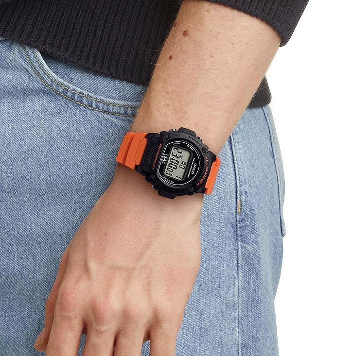 Мужские кварцевые электронные наручные часы. Серия Standard Digital. Дисплей подсвечивается светодиодом. 12-ти и 24-х часовой формат отображения времени. Секундомер с точностью показаний 1/100 с и временем измерения 1ч. Режимы измерений: отдельные отрезки времени, измерение с разделением, два финишных результата. Ежедневный будильник, сигнал начала часа. Автоматический календарь до 2099г с установкой 28 дней на февраль. Круглый корпус из полимерного пластика чёрного цвета. Размеры корпуса 47 мм на 48,1 мм, толщина 13,9 мм. Пластиковое стекло. Оранжевый пластиковый ремешок с классической застежкой buckle. Приблизительный срок службы аккумулятора 7 лет. Водонепроницаемость 50WR (мытьё рук, дождь). Вес около 40 г.