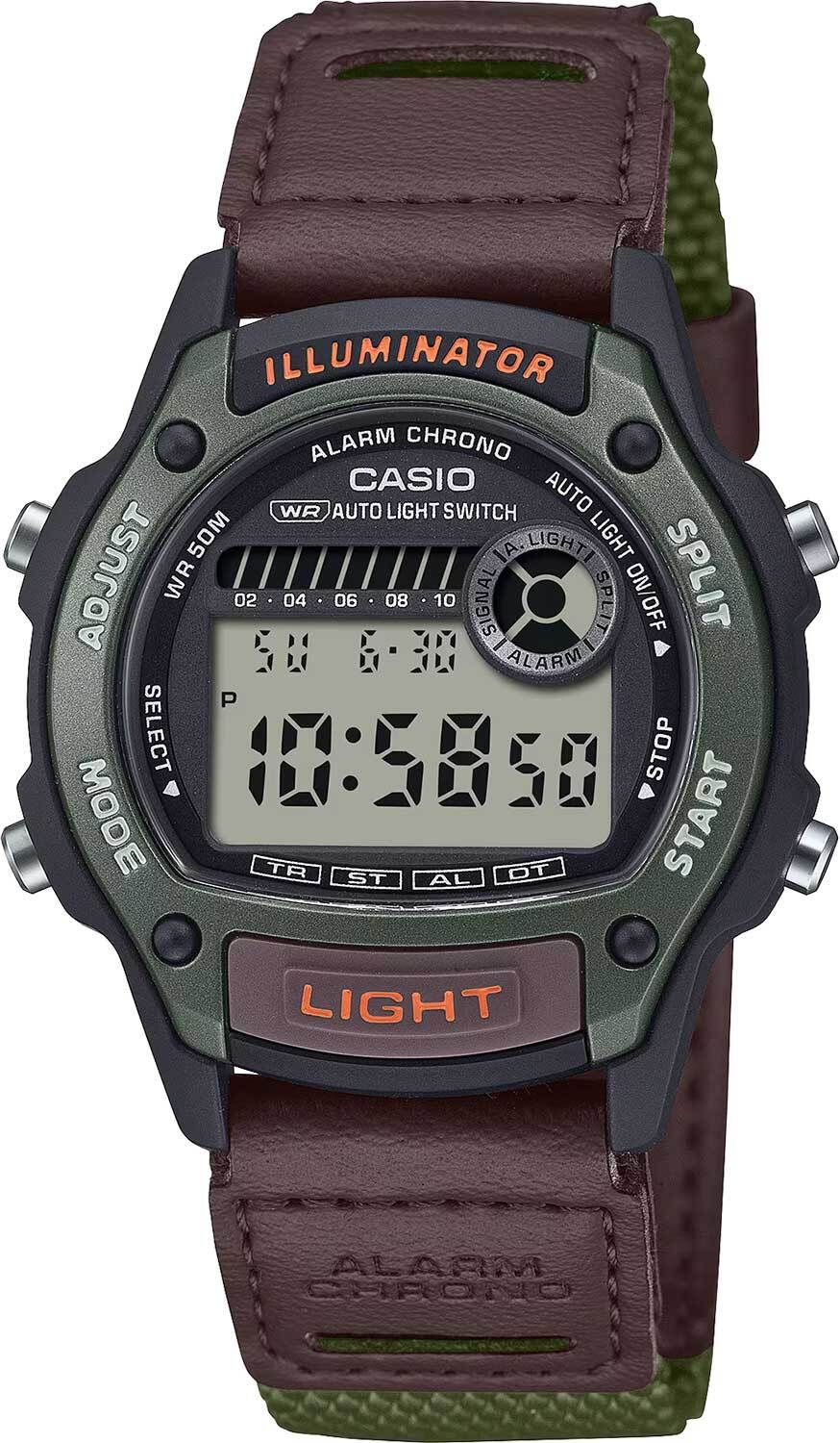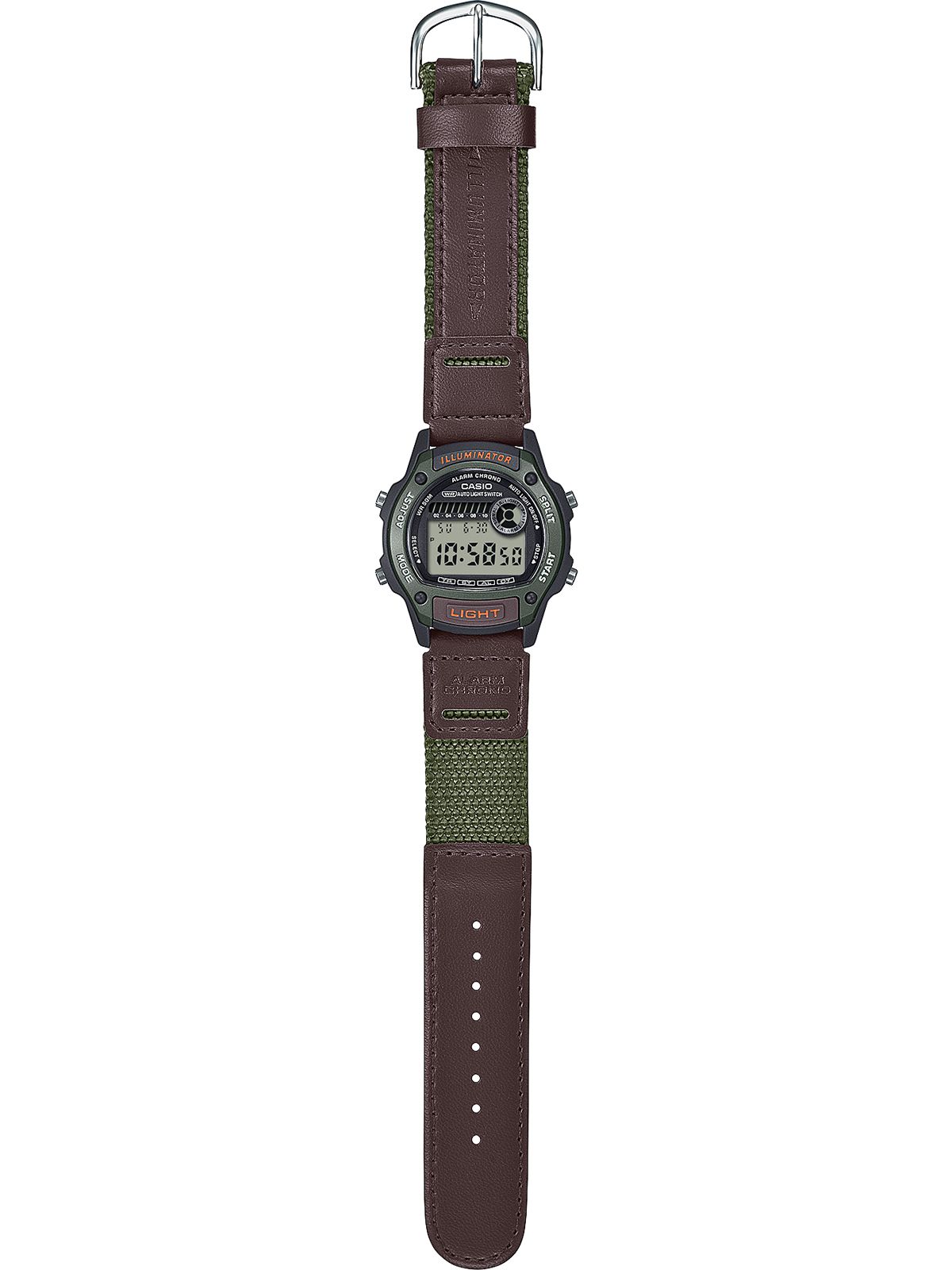 Мужские кварцевые наручные часы с цифровым отображением времени. Серия Casio Collection Standard Digital. Циферблат подсвечивается светодиодом с функцией послесвечения. Цвет подсветки оранжевый. 12-ти и 24-х часовой формат отображения времени. Секундомер с точностью показаний 1/100 с (до 1 ч) и 1 с (после 1 ч) и временем измерения 24часа. Таймер обратного отсчета от 1минуты до 24часов с автоповтором. Ежедневный будильник, ежечасный сигнал. Второй часовой пояс (отображение времени двух часовых поясов одновременно). Автоматический календарь до 2099 года. Круглый корпус из полимерного пластика чёрного цвета с зелёным рантом. Размеры корпуса 36,6мм на 43 мм, толщина 10,9 мм. Выпуклое пластиковое стекло. Зелёный текстильный ремешок с коричневыми кожаными вставками, классическая застежка buckle. Батарейка рассчитана на 3 года. Водонепроницаемость WR50 (мытьё рук, дождь). Вес около 26 г.