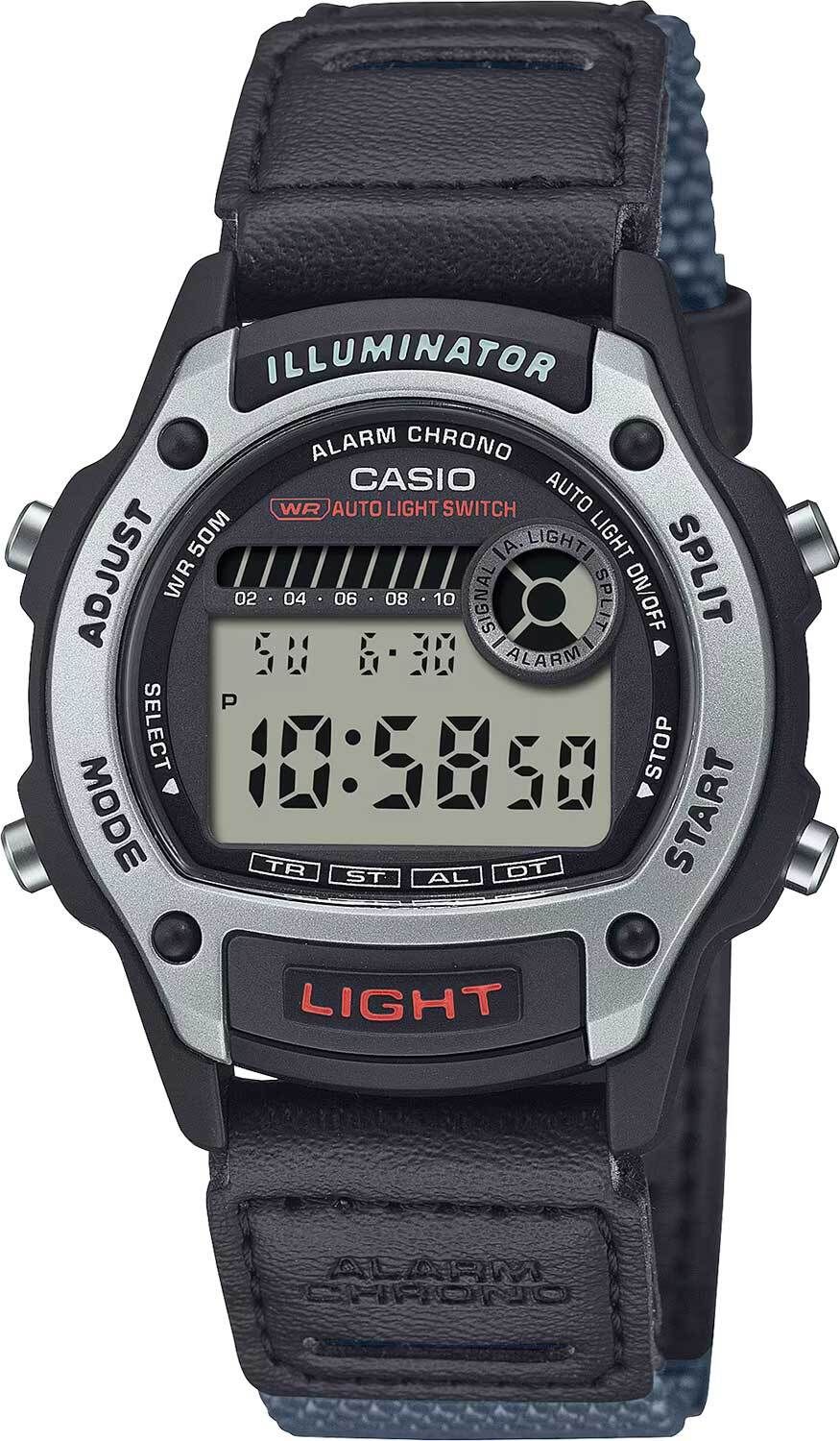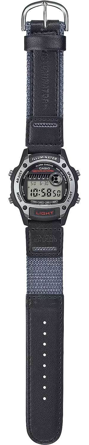 Мужские кварцевые наручные часы с цифровым отображением времени. Серия Casio Collection Standard Digital. Циферблат подсвечивается светодиодом с функцией послесвечения. Цвет подсветки оранжевый. 12-ти и 24-х часовой формат отображения времени. Секундомер с точностью показаний 1/100 с (до 1 ч) и 1 с (после 1 ч) и временем измерения 24часа. Таймер обратного отсчета от 1минуты до 24часов с автоповтором. Ежедневный будильник, ежечасный сигнал. Второй часовой пояс (отображение времени двух часовых поясов одновременно). Автоматический календарь до 2099 года. Круглый корпус из полимерного пластика чёрного цвета с рантом серебристого цвета. Размеры корпуса 36,6мм на 43 мм, толщина 10,9 мм. Выпуклое пластиковое стекло. Серый текстильный ремешок с чёрными кожаными вставками, классическая застежка buckle. Батарейка рассчитана на 3 года. Водонепроницаемость WR50 (мытьё рук, дождь). Вес около 26 г.