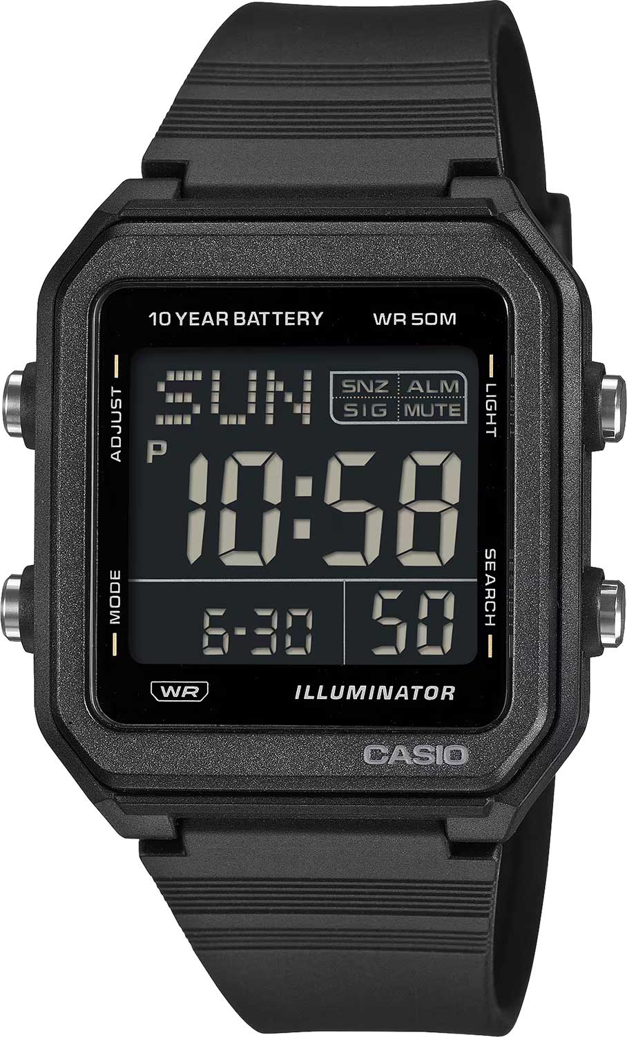 Мужские кварцевые наручные часы с цифровой индикацией времени. Серия Standard Digital. Практичные часы для повседневного использования. Лаконичный дизайн и стальной браслет делают часы универсальным аксессуаром для работы, спорта и активного отдыха. Светодиодная подсветка с функцией послесвечения. 12-ти и 24-х часовой формат отображения времени. Второй часовой пояс (позволят отображать время двух часовых поясов одновременно). Секундомер с точностью показаний 1/100 секунды и временем измерения 24 часа. Режимы измерений: отдельные отрезки времени, измерение с разделением, два финишных результата. Многофункциональный будильник: ежедневный сигнал, ежемесячный сигнал, каждый день определенного месяца, на определенную дату, сигнал начала часа. Один будильник с функцией повтора сигнала Snooze. Автоматический календарь до 2099г. Прямоугольный корпус из полимерного пластика серебристого цвета. Размеры корпуса 44,2 мм на 36,8 мм, толщина 13,4 мм. Стальной браслет с раскладывающейся застёжкой. Водонепроницаемость 100WR (часы подходят для плавания с маской, трубкой, обычного плавания). Батарея рассчитана на 10 лет. Вес около 91 г.