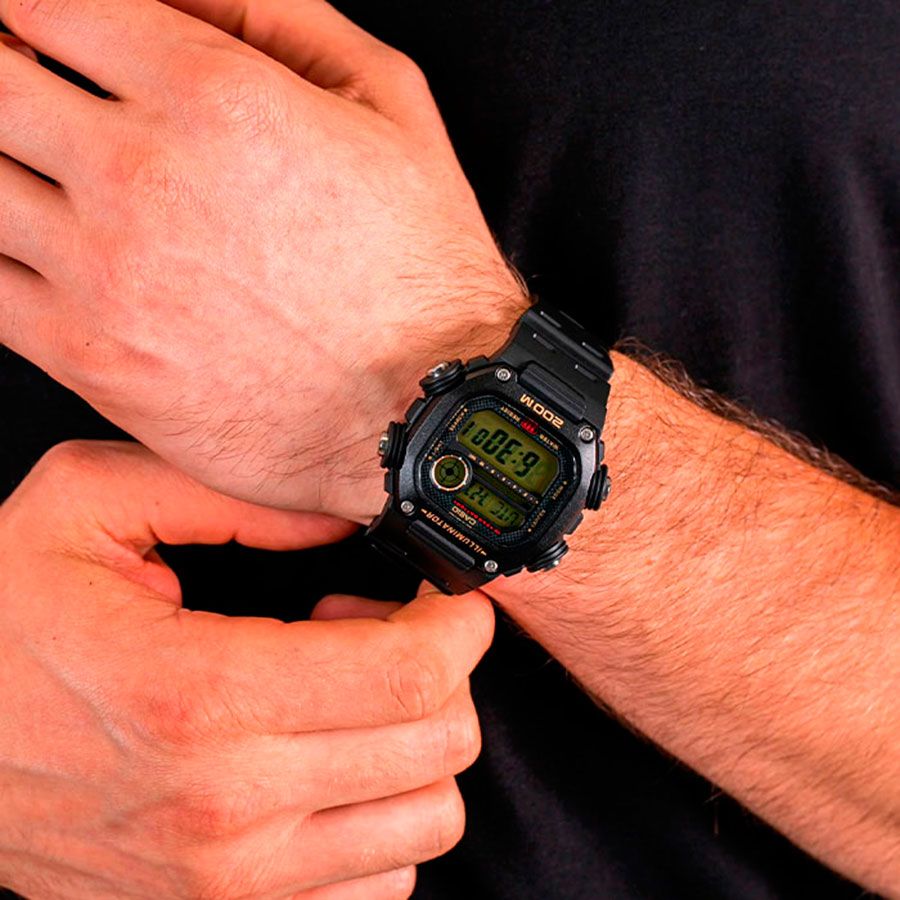 Мужские кварцевые электронные часы. Серия Standard Digital. Светодиодная подсветка с функцией послесвечения 1,5 или 3 секунды. Мировое время – 48 городов (31 часовой пояс), всемирное координированное время (UTC), функция включения/отключения летнего времени, переключение между домашним и мировым временем. 4 часовые зоны (функция Мульти Тайм) - 1 экран отображения времени и даты для города текущего местонахождения, 3 экрана отображения времени и даты другого региона. Секундомер с точностью показаний 1/100 секунды и временем измерения 24 часа. Режимы измерения: прошедшее время, промежуточное время, два финишных результата. Таймер обратного отсчета от 1 секунды до 24 часов. 5 ежедневных будильников, ежечасный сигнал. Автоматический календарь до 2099г. 12-ти и 24-х часовой формат отображения времени. Функция включения/выключения звука кнопок (Mute). Прямоугольный корпус из полимерного пластика чёрного цвета. Размер корпуса 50,5 мм на 50,4 мм, толщина 13,5 мм. Устойчивое к мелким механическим повреждениям минеральное стекло. Чёрный пластиковый ремешок с классической застежкой buckle. Батарея рассчитана на 10 лет. Водонепроницаемость WR200 (часы подходят для плавания с маской, трубкой, обычного плавания). Вес около 63 г.