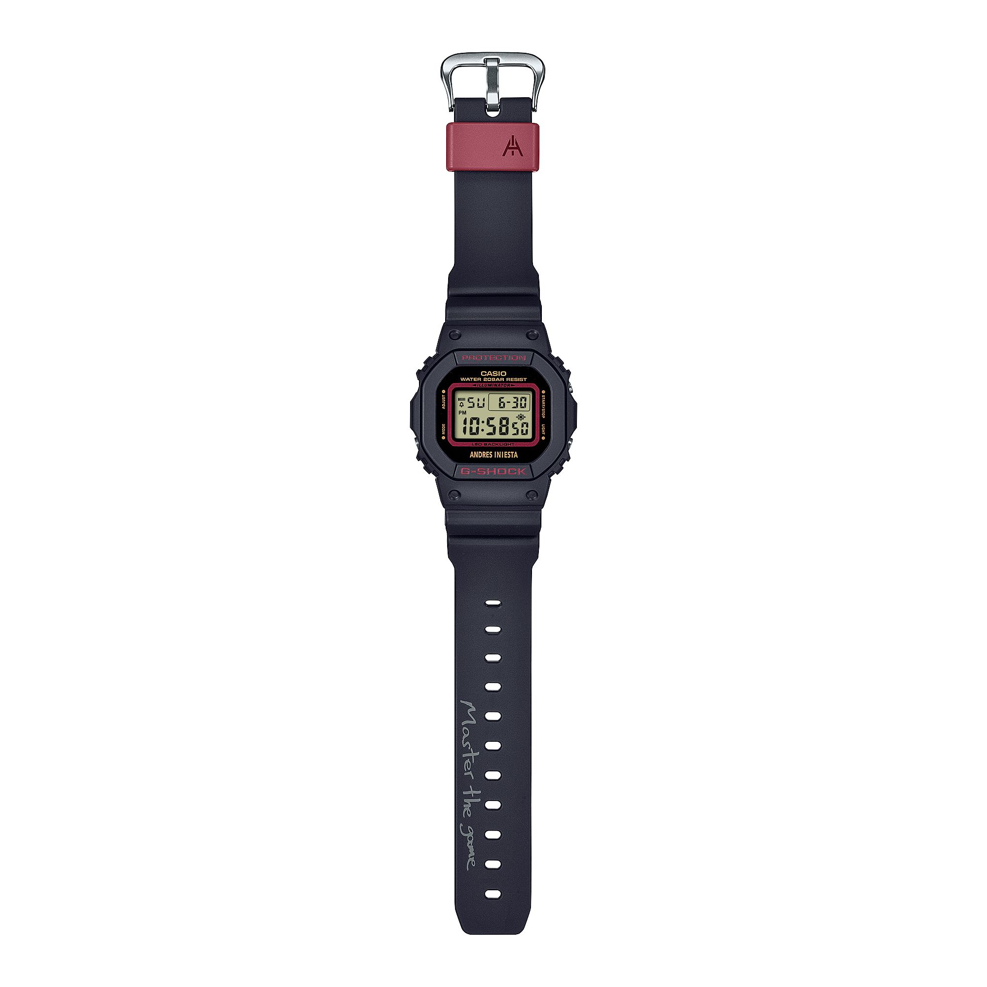 Мужские кварцевые электронные часы. Коллекция G-Shock limited. Модель выпущена ограниченным тиражом в сотрудничестве с испанским футболистом Андресом Иньестой. Имя футболиста написано крупными буквами на циферблате часов, левая нижняя кнопка отмечена гравировкой цифры “8” — номер на футболке Иньесты. На задней крышке часов дизайнеры разместили подпись Андреаса Иньесты, а на ремешке напечатано короткое послание «Master the game» («Освойте игру»), написанное рукой спортсмена. Держатель ремешка украшен личным логотипом Андреаса Иньесты в виде комбинации букв A и I. При активации подсветки на дисплее проявляется силуэт Андреаса Иньесты, запечатлевший легендарный гол, который он забил в 2010 году, принеся команде сборной Испании победу в чемпионате мира по футболу. Противоударный корпус защищает механизм часов от ударов и вибрации. Светодиодная подсветка с функцией послесвечения. Световой сигнал (LED-индикатор) - светодиодная лампочка мигает при сигнале будильника, окончании таймера обратного отсчета или секундомера. Секундомер с точностью показаний 1/100 секунды (первый час), 1 секунда (через 1 час) и временем измерения 24 часа. Режимы измерения: прошедшее время, промежуточное время, два финишных результата. Таймер обратного отсчета от 1 секунды до 24 часов (с интервалом в 1 секунду, с интервалом в 1 минуту и с интервалом в 1 час) с автоповтором. 12-ти и 24-х часовой формат отображения времени. Многофункциональный будильник, ежедневный звуковой сигнал, индикация начала часа. Автоматический календарь до 2099 г. Прямоугольный корпус из биопластика чёрного цвета. Размер корпуса 43,8 мм на 48,9 мм ,толщина 13,4 мм. Чёрный пластиковый ремешок с классической застежкой. Минеральное стекло устойчивое к мелким механическим повреждениям. Батарейка рассчитана на 5 лет. Водостойкость WR 200 (плавание и ныряние без акваланга). Вес примерно 53 г. Часы поставляются в специальной эко-упаковке, изготовленной из переработанных материалов. В комплект также входит фирменный наклейка-стикер от Андреаса Иньесты.