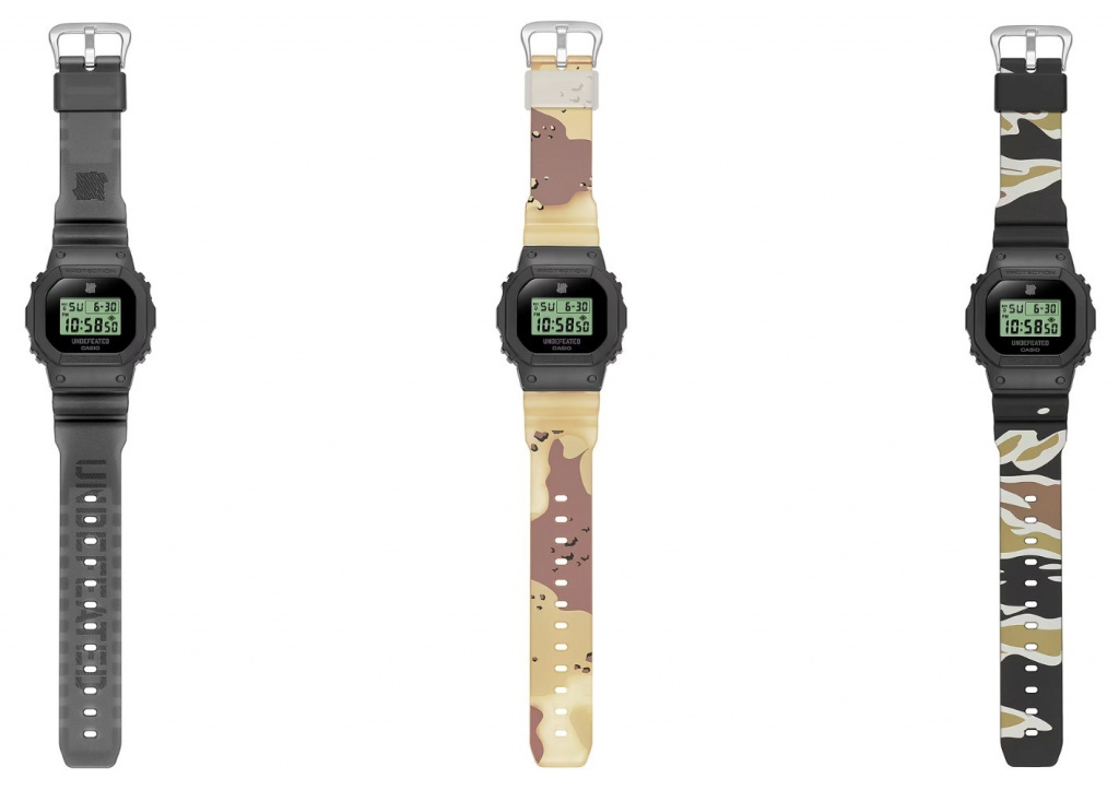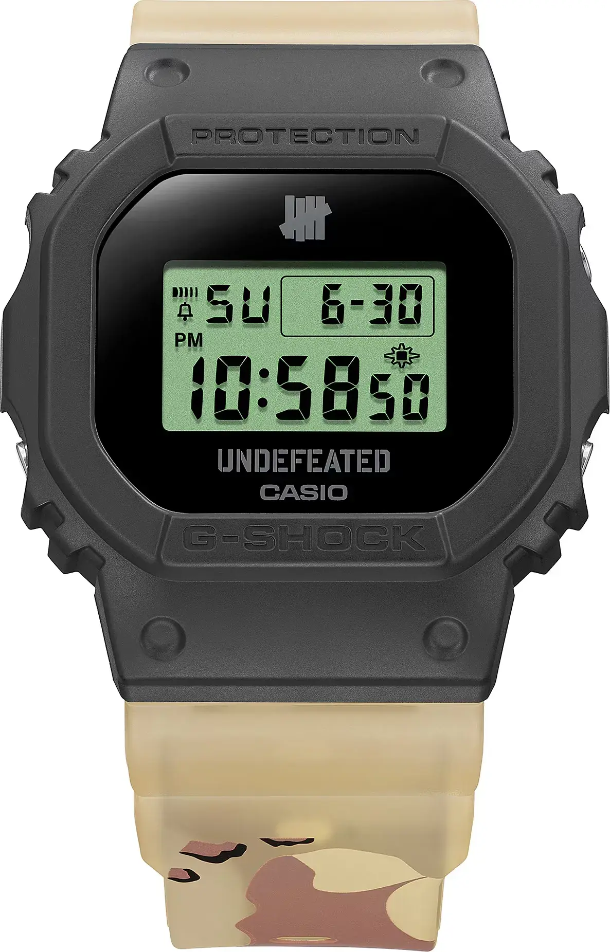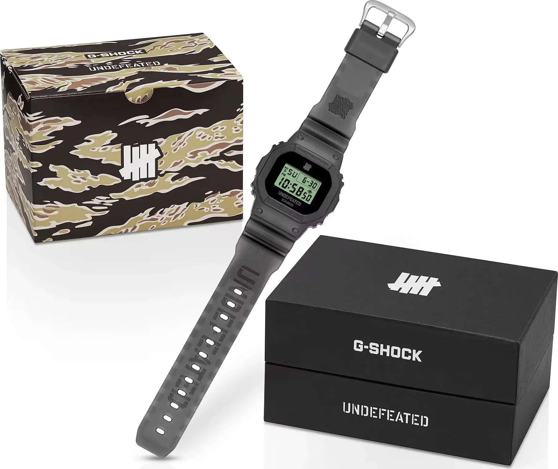 Мужские кварцевые наручные часы с цифровым отображением времени. Серия G-Shock limited. Лимитированная модель (выпущена ограниченным тиражом). Модель создана при сотрудничестве бренда G-Shock с известным модным брендом и бутиком уличной одежды Undefeated из Лос-Анджелеса. Комплектация DWE-5600UD-1 включает в себя два дополнительных ремешка с фирменным камуфляжным дизайном от Undefeated — тигровый (непрозрачный) и штормовой камуфляж (с полупрозрачной основой), благодаря чему можно комбинировать разные варианты и создавать свой уникальный стиль. Ллоготипы Undefeated и CASIO нанесены на циферблат часов. Противоударный пластиковый корпус защищает механизм часов от ударов и вибраций. Электролюминесцентная подсветка освещает весь циферблат, после отпускания кнопки свечение продолжается еще некоторое время. При активации подсветки цвет ЖК-дисплея меняется на красный и одновременно отображается эмблема Undefeated. 12-ти и 24-х часовой формат отображения времени. Световая индикация сигнала (LED-индикатор) - лампочка мигает при сигнале будильнике, окончании работы таймера обратного отсчета или секундомера. Секундомер с точностью показаний 1/100 секунды (для первых 60 минут) и 1 секунда (после 60 минут) и временем измерения 24 часа. Режимы измерения: отдельные отрезки времени, промежуточное время, два финишных результата. Таймер обратного отсчета от 1 секунды до 24 часов с автоповтором. Будильник с многофункциональными звуковыми сигналами, сигнал начала часа. Автоматический календарь до 2039 года. Прямоугольный корпус из полимерного пластика чёрного цвета. Размеры корпуса 48,9 мм на 43,8 мм, толщина 13,7 мм. Устойчивое к мелким механическим повреждениям минеральное стекло. Чёрный пластиковый ремешок с классической застёжкой Buckle. В комплект входят дополнительные ремешки: полупрозрачный коричневый с пустынным камуфляжем и черный с коричневым камуфляжным принтом. На основном ремешке с внутренней стороны тиснение в виде названия бренда Undefeated. Фирменная символика Casio и Undefeated выгравирована на задней крышке корпуса. Батарейка рассчитана на 5 лет. Водонепроницаемость 200WR (плавание и ныряние без акваланга). Вес около 54 г. Часы поставляются в оригинальной упаковке.