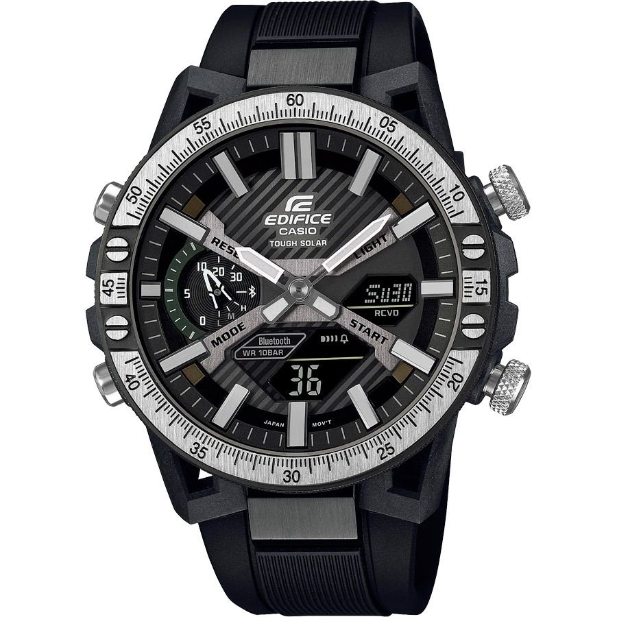 Мужские кварцевые аналого-цифровые наручные часы на солнечной батарее. Серия Casio Edifice. Время работы при полном заряде до 7 месяцев, в режиме энергосбережения до 18 месяцев. Индикатор уровня заряда батареи. Часы оснащены технологией Bluetooth. Если часы подключены к смартфону, время устанавливается автоматически и отображается текущее время. Двойная автоматическая светодиодная подсветка с функцией послесвечения. Настраиваемая длительность подсветки (1.5 или 3 секунды). Секундомер с точностью показаний 1/100 секунды и пределом измерения 24 часа. Таймер - время можно предварительно настроить от 1 секунды и до 1 часа. Мировое время: 38 часовых зон ( 38 городов, всемирное координированное время). Функция включения/отключения летнего времени. 5 ежедневных будильников. Автоматический календарь (до 2099 года). Включение/выключение звука кнопок. Функция поиска телефона. Размеры корпуса 48 мм х 51 мм х 11 мм. Черный пластиковый ремешок, стандартная застежка. Прочное минеральное стекло устойчивое к мелким механическим повреждениям. Водостойкость WR 100 (плавание без погружения). Вес 69г.