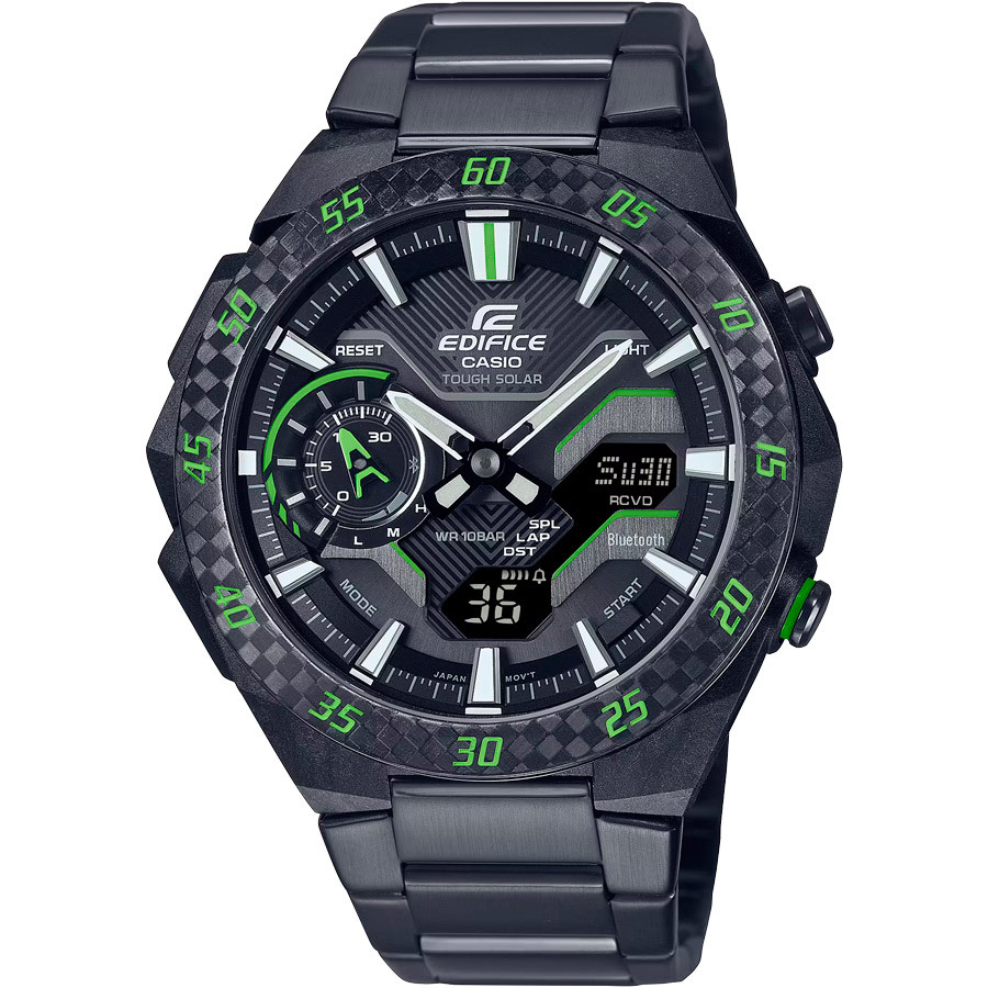 Мужские кварцевые аналого-цифровые часы. Серия Edifice Windflow. Дизайн часов вдохновлен воздушным потоком вокруг гоночного автомобиля. Корпус часов выполнен из композитного материала на основе углеродного волокна, безель изготовлен из того же материала, а черный ободок из нержавеющей стали с ионным напылением. Питание от солнечной энергии Tought Solar- источником питания служит светочувствительная панель и аккумулятор, заряжаемый при попадании солнечного света на циферблат часов. Индикатор уровня заряда батареи. Функция энергосбережения (в темноте дисплей гаснет для экономии энергии). Время работы аккумулятора без подзарядки около 7 месяцев, при включенной функции сохранения энергии около 18 месяцев. Синхронизация со смартфоном с помощью беспроводной энергосберегающей технологии Bluetooth®. При подключении к смартфону часы корректируют текущее время, настраивают будильник, а также копируют настройки мирового времени (до 300 городов). Двойная светодиодная подсветка обеспечивает подсветку не только аналогового циферблата, но и цифрового дисплея. Настраиваемое послесвечение 1.5 или 3 секунды. Необритовое светонакопительное покрытие стрелок обеспечивает длительное послесвечение в темноте даже после кратковременного воздействия света. Мировое время – 38 городов (38 часовых поясов), всемирное координированное время (UTC). Автоматический переход на зимнее и летнее время, возможность включения/отключения данной функции. Переключение между домашним и мировым временем. Отображение кода и названия города. Секундомер с точностью показаний 1/100 с (в течение первого часа), 1 секунда (через 1 час) и временем измерения 24 ч. Режимы измерения: прошедшее время, время прохождения части и круга дистанции. Память на 200 кругов. Таймер обратного отсчета от 1 секунды до 60 минут. 30-минутный стрелочный индикатор обратного отсчета (малый отдельный циферблат в положении 9 ч) показывает время до следующего сигнала будильника и время, оставшееся до окончания работы таймера. 5 ежедневных будильников, ежечасный сигнал. Автоматический календарь до 2099 года. Отображение дней недели на шести языках. Функция перемещения стрелок для удобного просмотра информации на цифровом экране. Функция поиска телефона. Функция включения/отключения звука кнопок. 12-ти и 24-х часовой формат отображения времени. Функция Flight Log Memory - можно записать данные о точном местоположении с указанием времени и даты (TIME & PLACE). Круглый из композитного материала на основе углеродного волокна с чёрным IP покрытием. Размер корпуса 48,2 мм на 47,6 мм, толщина 11,9 мм. Безель из углеродного волокна, минутная шкала на безеле. Стальной браслет с IP покрытием чёрного цвета, тройная раскладывающаяся застёжка. Устойчивое к мелким механическим повреждениям минеральное стекло. Водонепроницаемость 100WR (часы подходят для плавания с маской и трубкой. Обычного плавания). Вес около 121 г.