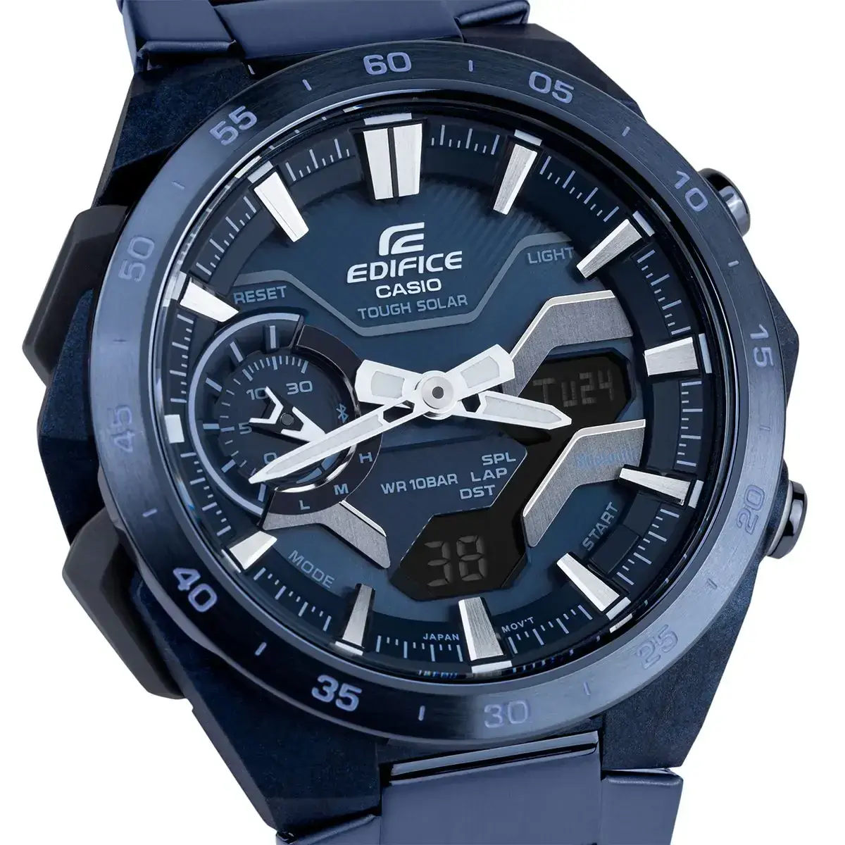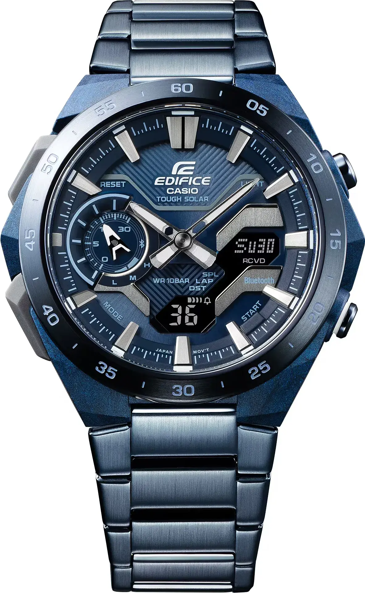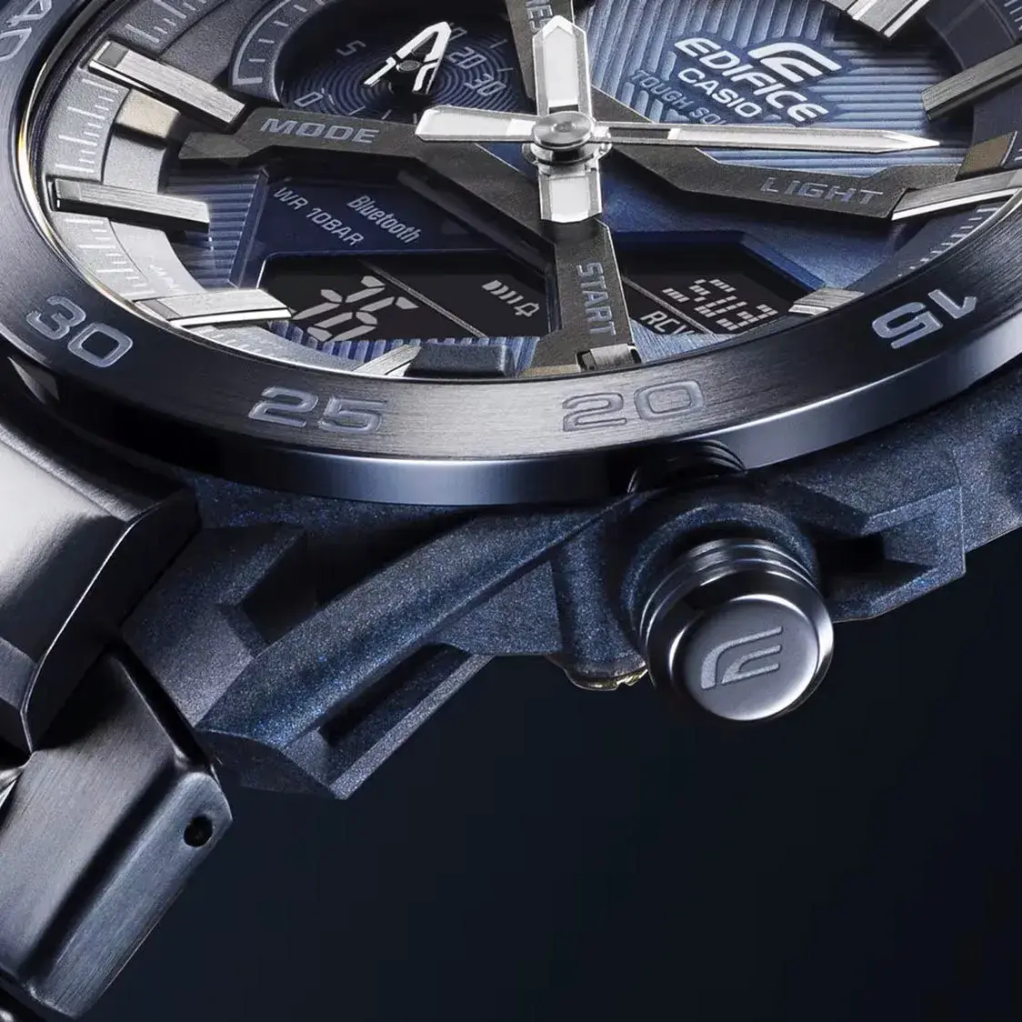 Мужские кварцевые аналогово-цифровые часы. Серия Edifice Windflow. Дизайн часов вдохновлен воздушным потоком вокруг гоночного автомобиля. Питание от солнечной энергии Tought Solar- источником питания служит светочувствительная панель и аккумулятор, заряжаемый при попадании солнечного света на циферблат часов. Индикатор уровня заряда батареи. Функция энергосбережения (в темноте дисплей гаснет для экономии энергии). Примерный срок работы аккумулятора без подзарядки в обычном режиме до 7 месяцев, при включенной функции сохранения энергии до 18 месяцев. Синхронизация со смартфоном с помощью беспроводной энергосберегающей технологии Bluetooth®. При подключении к смартфону часы корректируют текущее время, настраивают будильник, а также копируют настройки мирового времени (до 300 городов). Двойная светодиодная подсветка (светодиод подсвечивет циферблат и ЖК-дисплей) с функцией послесвечения. Настраиваемая длительность подсветки 1.5 или 3 секунды. Необритовое светонакопительное покрытие стрелок обеспечивает длительное послесвечение в темноте даже после кратковременного воздействия света. Мировое время – 38 городов (38 часовых поясов), всемирное координированное время (UTC). Автоматический переход на зимнее и летнее время, возможность включения/отключения данной функции. Переключение между домашним и мировым временем. Секундомер с точностью показаний 1/100 с (в течение первого часа), 1 секунда (через 1 час) и временем измерения до 24 часов. Режимы измерения: прошедшее время, время прохождения части и круга дистанции. Память на 200 кругов. Таймер обратного отсчета от 1 секунды до 60 минут. 30-минутный стрелочный индикатор обратного отсчета (малый отделный циферблат в положении 9 ч) показывает время до следующего сигнала будильника и время, оставшеея до окончания работы таймера. 5 ежедневных будильников, ежечасный сигнал. Автоматический календарь до 2099 года. Отображение дней недели на шести языках. Функция перемещения стрелок для удобного просмотра информации на цифровом экране. Функция поиска телефона. Функция включения/отключения звука кнопок. 12-ти и 24-х часовой формат отображения времени. Функция Flight Log Memory - можно записать данные о точном местоположении с указанием времени и даты (TIME & PLACE). .Круглый корпус из полимерного пластика, усиленного углеродними волокнами индигово-синего цвета. Размеры корпуса 48,2 мм на 47,6 мм, толщина 11,9 мм. Стальной безель с покрытием синего цаета, минутная шкала на безеле. Стальной браслет с покрытием чинего цвета, тройная раскладывающаяся застёжка. Устойчивое к мелким механическим поврежениям минеральное стекло. Водостойкость WR 100 (плавание с маской и трубкой). Вес около 126 г.