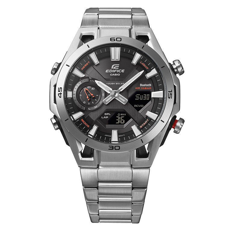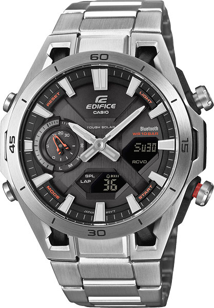 Мужские кварцевые аналого-цифровые наручные часы на солнечной батарее. Серия Edifice Sospensione -сочетание функциональности и элегантности, вдохновленное автоспортом. Особенностью модели является прочный и легкий стальной корпус усиленный углеродными волокнами. Это одни из немногих часов линейки Edifice в карбоновом корпусе. Дизайн часов вдохновлён внешним видом болидов Формулы-1: конструкция корпуса выполнена в стилистике подвесок гоночных автомобилей, в которых колеса болида крепятся к шасси на карбоновых лучах. Питание от солнечной энергии (технология Tough Solar) - источником питания служит светочувствительная панель и аккумулятор, заряжаемый при попадании солнечного света на циферблат часов. Время работы при полном заряде до 7 месяцев, в режиме энергосбережения до 18 месяцев. Индикатор уровня заряда батареи. Функция автоматического энергосбережения (в темноте дисплей гаснет, а стрелки останавливаются). Часы оснащены беспроводной технологией Bluetooth® со сверхнизким потреблением энергии для синхронизации со смартфоном. При подключении к смартфону часы автоматически корректируют текущее время и получают доступ к ряду полезных функций. Двойная автоматическая светодиодная подсветка с функцией послесвечения (одновременно подсвечивается аналоговый циферблат и цифровой дисплей). Настраиваемая длительность подсветки 1.5 или 3 секунды. При недостаточном освещении поворот руки обеспечит автоматическое включение подсветки. Светонакопительное покрытие (Neobrite) стрелок обеспечивает длительное послесвечение в темноте после кратковременного воздействия света. Секундомер с точностью показаний 1/100 секунды и временем измерения 24 часа. Таймер обратного отсчета от 1 секунды и до 1 часа с автоповтором. Мировое время - 38 часовых зон (38 городов), всемирное координированное время (UTC), включение/отключение летнего времени. 5 ежедневных будильников, ежечасный сигнал. Автоматический календарь до 2099 года, отображение дней недели на 6 языках. Включение/выключение звука кнопок. Функция поиска телефона. Функция перемещения стрелок для удобного просмотра информации на цифровых дисплеях.12/24-часовой формат отображения времени. Круглый стальной корпус с углеродными волокнами более прочный и лёгкий. Минутная шкала на безеле. Размеры корпуса 45,8 мм на 50,2 мм, толщина 10,9 мм. Чёрный циферблат с часовыми метками в виде штрихов. Устойчивое к мелким механическим повреждениям минеральное стекло. Стальной браслет с раскладывающейся застежкой. Водонепроницаемость 100WR (часы подходят для плавания с маской, трубкой, обычного плавания). Вес около 122г.