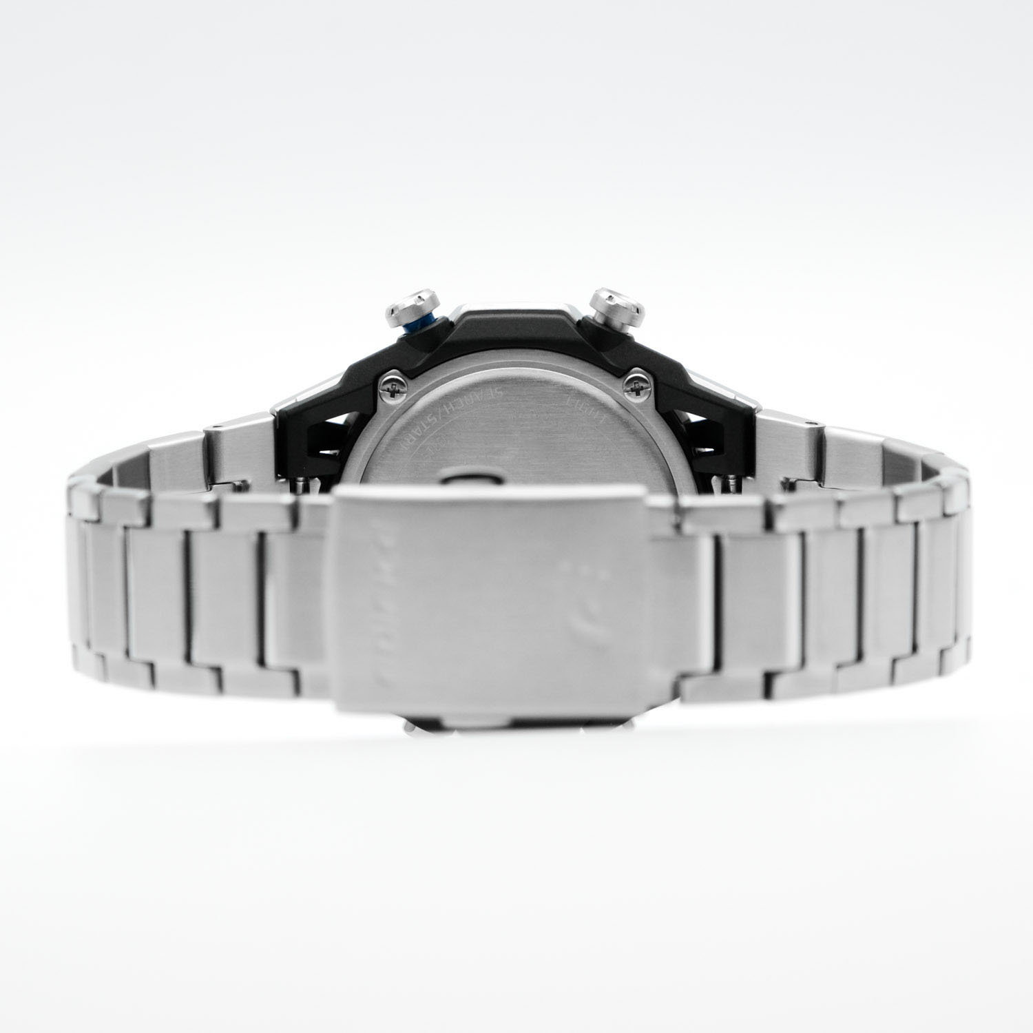 Мужские кварцевые аналого-цифровые наручные часы на солнечной батарее. Серия Edifice Sospensione -сочетание функциональности и элегантности, вдохновленное автоспортом. Особенностью модели является прочный и легкий стальной корпус усиленный углеродными волокнами. Это одни из немногих часов линейки Edifice в карбоновом корпусе. Дизайн часов вдохновлён внешним видом болидов Формулы-1: конструкция корпуса выполнена в стилистике подвесок гоночных автомобилей, в которых колеса болида крепятся к шасси на карбоновых лучах. Питание от солнечной энергии (технология Tough Solar) - источником питания служит светочувствительная панель и аккумулятор, заряжаемый при попадании солнечного света на циферблат часов. Время работы при полном заряде до 7 месяцев, в режиме энергосбережения до 18 месяцев. Индикатор уровня заряда батареи. Функция автоматического энергосбережения (в темноте дисплей гаснет, а стрелки останавливаются). Часы оснащены беспроводной технологией Bluetooth® со сверхнизким потреблением энергии для синхронизации со смартфоном. При подключении к смартфону часы автоматически корректируют текущее время и получают доступ к ряду полезных функций. Двойная автоматическая светодиодная подсветка с функцией послесвечения (одновременно подсвечивается аналоговый циферблат и цифровой дисплей). Настраиваемая длительность подсветки 1.5 или 3 секунды. При недостаточном освещении поворот руки обеспечит автоматическое включение подсветки. Светонакопительное покрытие (Neobrite) стрелок обеспечивает длительное послесвечение в темноте после кратковременного воздействия света. Секундомер с точностью показаний 1/100 секунды и временем измерения 24 часа. Таймер обратного отсчета от 1 секунды и до 1 часа с автоповтором. Мировое время - 38 часовых зон (38 городов), всемирное координированное время (UTC), включение/отключение летнего времени. 5 ежедневных будильников, ежечасный сигнал. Автоматический календарь до 2099 года, отображение дней недели на 6 языках. Включение/выключение звука кнопок. Функция поиска телефона. Функция перемещения стрелок для удобного просмотра информации на цифровых дисплеях.12/24-часовой формат отображения времени. Круглый стальной корпус с углеродными волокнами более прочный и лёгкий. Минутная шкала на безеле. Размеры корпуса 45,8 мм на 50,2 мм, толщина 10,9 мм. Синий циферблат с часовыми метками в виде штрихов. Устойчивое к мелким механическим повреждениям минеральное стекло. Стальной браслет с раскладывающейся застежкой. Водонепроницаемость 100WR (часы подходят для плавания с маской, трубкой, обычного плавания). Вес около 122г.