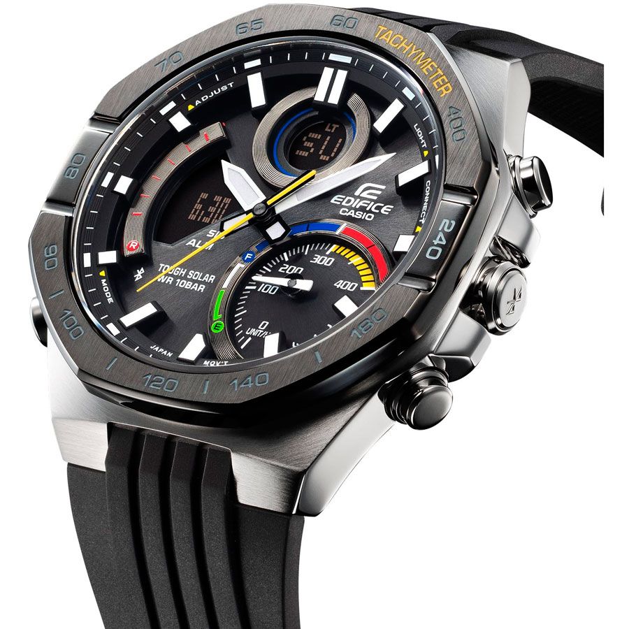 Мужские кварцевые аналого-цифровые наручные часы. Серия Casio Edifice. Питание от солнечной энергии (технология Tough Solar) - источником питания служит светочувствительная панель и аккумулятор, заряжаемый при попадании солнечного света на циферблат часов. Индикатор низкого уровня заряда батареи. Функция автоматического сохранения энергии. Время работы аккумулятора без подзарядки приблизительно 6 месяцев, при включенной функции сохранения энергии приблизительно 19 месяцев. Полностью автоматическая двойная светодиодная подсветка Super Illuminator с функцией Afterglow (для подсветки не нужно удерживать кнопку) -поворот руки при недостаточном освещении обеспечит автоматическое включение подсветки циферблата, настройка продолжительности подсветки 1,5 или 3 с. Светонакопительное покрытие стрелок и меток Neobrite обеспечивает длительное послесвечение в темноте даже после кратковременного воздействия света. 12-ти и 24-х часовой формат отображения времени. На безеле разметка тахиметрической шкалы (для расчета скорости на основании времени в пути). Секундомер с точностью показаний 1/1000 с (до 1 часа) и 1/10 с (после 1 часа) и временем измерения 24 часа. Таймер обратного отсчета от 1 с до 24 часов. Мировое время – 39 городов (39 часовых поясов), автоматический переход на зимнее и летнее время, возможность включения/отключения данной функции. Беспроводная технология Bluetooth® со сверхнизким потреблением энергии для синхронизации со смартфоном. При подключении к смартфону часы автоматически корректируют текущее время, в том числе переход на зимнее/летнее время, копируют настройки мирового времени более чем для 300 городов, оповещают при поступлении звонка на мобильный телефон. Приложение EDIFICE Connected позволяет вести журнал показаний секундомера и прохождения этапов, вычислять разность между заданным временем и временем этапа. Память на 200 этапов. Измерение скорости отображается на ретроградном циферблате в положении 4 часа. Функция перемещения стрелок для удобного просмотра информации на цифровых дисплеях. Функция включения/отключения звука кнопок. Автоматический календарь до 2099 года. Функция поиска телефона. Переводная головка с защитой. Восьмиугольный стальной корпус размером 48 мм на 51,2мм, толщиной 13,9мм. Стальной безель с чёрным IP-покрытием. Устойчивое к мелким механическим повреждениям минеральное стекло. Чёрный пластиковый ремешок с классической застёжкой. Водонепроницаемость 100WR (часы подходят для плавания с маской, трубкой и обычного плавания). Вес около 103 г.