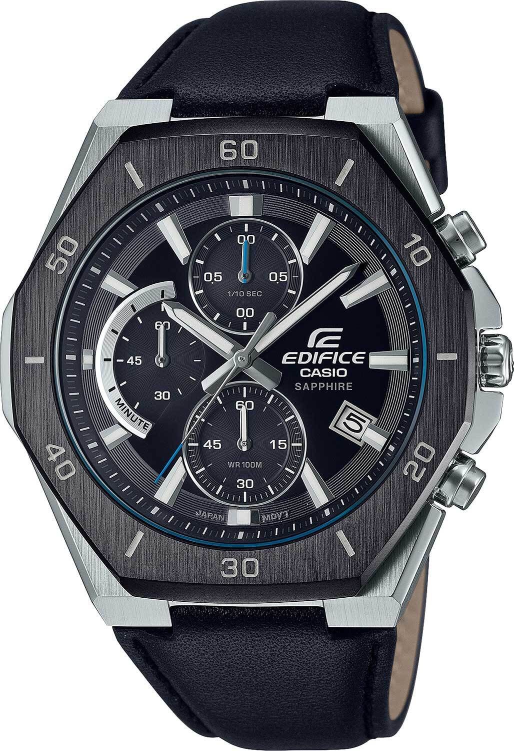 Мужские кварцевые аналоговые наручные часы-хронограф с секундомером. Серия Edifice. Чёрный циферблат с часовыми метками в виде штрихов. Центральные часовая, минутная и секундная стрелки. Стрелки и метки с люминесцентным покрытием, которое светится в темноте после непродолжительного воздействия света. Окошко даты в положении 4 ч. Секундомер с точностью показаний 1/10с и временем измерения 1час. Режимы измерения: прошедшее время, промежуточное время, два финишных результата. Корпус из нержавеющей стали с частичным чёрным покрытием на восьмиугольном безеле. Устойчивое к царапинам сапфировое стекло. Переводная головка с защитой. Чёрный кожаный ремешок с классической застежкой buckle. Батарейка рассчитана на 3 года. Водонепроницаемость 100 WR (плавание с маской и трубкой). Вес около 79 г.