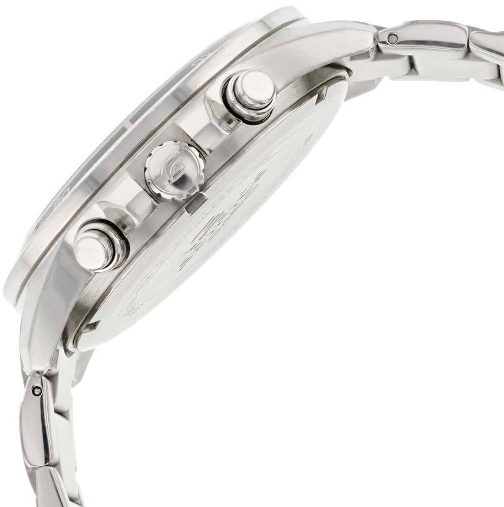 Мужские кварцевые аналоговые наручные часы- хронограф с секундомером. Серия Edifice. Центральные часовая, минутная и секундная стрелки. Белый циферблат с часовыми метками в виде штрихов. Стрелки и метки с люминесцентным покрытием, которое светится в темноте после непродолжительного воздействия света. Окошко даты в позиции 3 ч. Секундомер с точностью измерения 1/10 секунды и временем измерения 60 минут. Режимы измерения: прошедшее время, промежуточное время, два финишных результата. Устойчивое к мелким механическим повреждениям минеральное стекло. Круглый стальной корпус с IP покрытием чёрного цвета на безеле. Размер корпуса 48,5 мм на 43,8 мм, толщина 11,6 мм. Минутная шкала на безеле. Рифлёная переводная головка с защитой. Задняя крышка с винтовым фиксатором. Стальной браслет с тройной раскладывающейся застёжкой. Водонепроницаемость 100 WR (часы подходят для плавания с маской, трубкой и обычного плавания). Вес около 149 г.