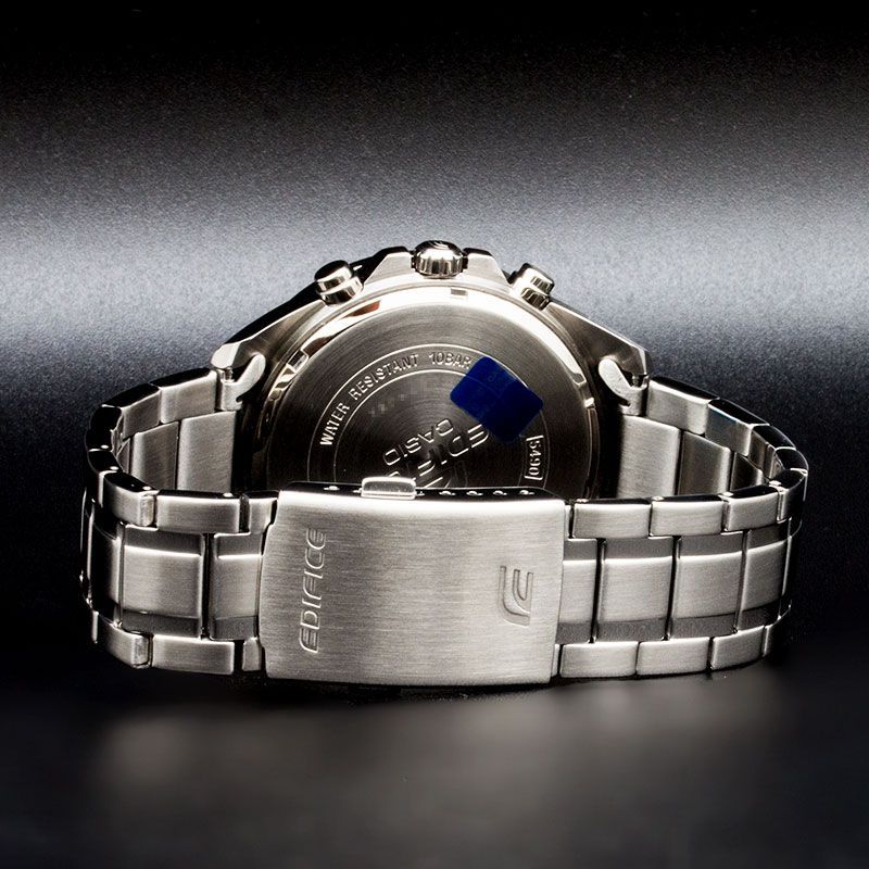 Мужские кварцевые аналоговые наручные часы-хронограф с секундомером. Серия Edifice. Центральные часовая, минутная и секундная стрелки. Чёрный циферблат с часовыми метками в виде штрихов. Стрелки и часовые метки с люминесцентным покрытием, которое светится в темноте после непродолжительного воздействия света. Индикация даты в позиции между 4 и 5 часами. Секундомер с точностью показаний 1 секунда и временем измерения 10 минут. Режимы измерения: прошедшее время, промежуточное время, два финишных результата. Стрелочный указатель времени суток с 24-х часовой шкалой на дополнительном малом циферблате в позиции 3 часов. Ретроградный (стрелочный указатель, движущийся на секторной части циферблата, и скачком возвращающийся обратно) указатель минутной стрелки хронографа в позиции 10 часов. Устойчивое к мелким механическим повреждениям минеральное стекло. Круглый стальной корпус чёрным IP покрытием на безеле. Минутная шкала на безеле. Размеры корпуса 53 мм на 47мм, толщина 12,3мм. Рифлёная переводная головка с защитой. Задняя крышка с винтовым фиксатором. Стальной браслет с тройной раскладывающейся застёжкой. Батарея рассчитана на 3 года. Водонепроницаемость 100WR (часы подходят для плавания с маской, трубкой, обычного плавания). Вес около 157 г.
