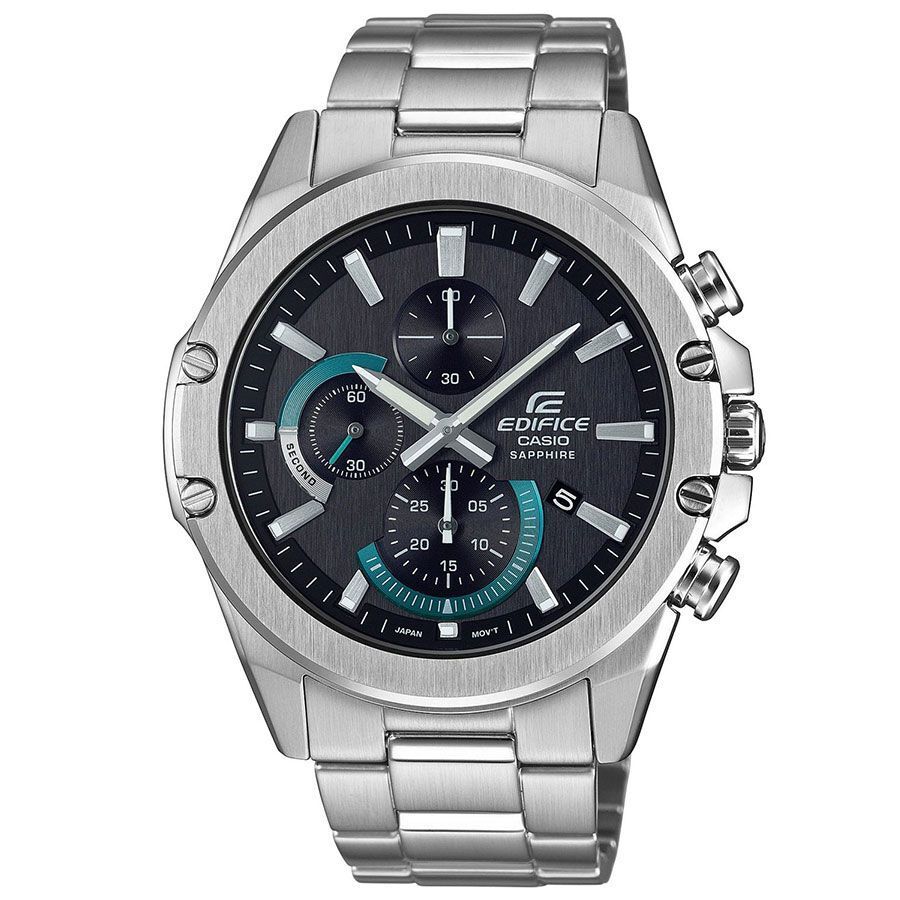 Мужские кварцевые аналоговые наручные часы-хронограф с секундомером. Серия Casio Edifice. Светонакопительное покрытие продолжает светиться в темноте даже после непродолжительного пребывания на свету. Секундомер с точностью показаний 1/1 с и временем измерения 30 мин. Центральные часовая и минутная стрелки, секундная стрелка вынесена на отдельный циферблат Окошко даты. Круглый стальной корпус. Сапфировое стекло. Стальной браслет.