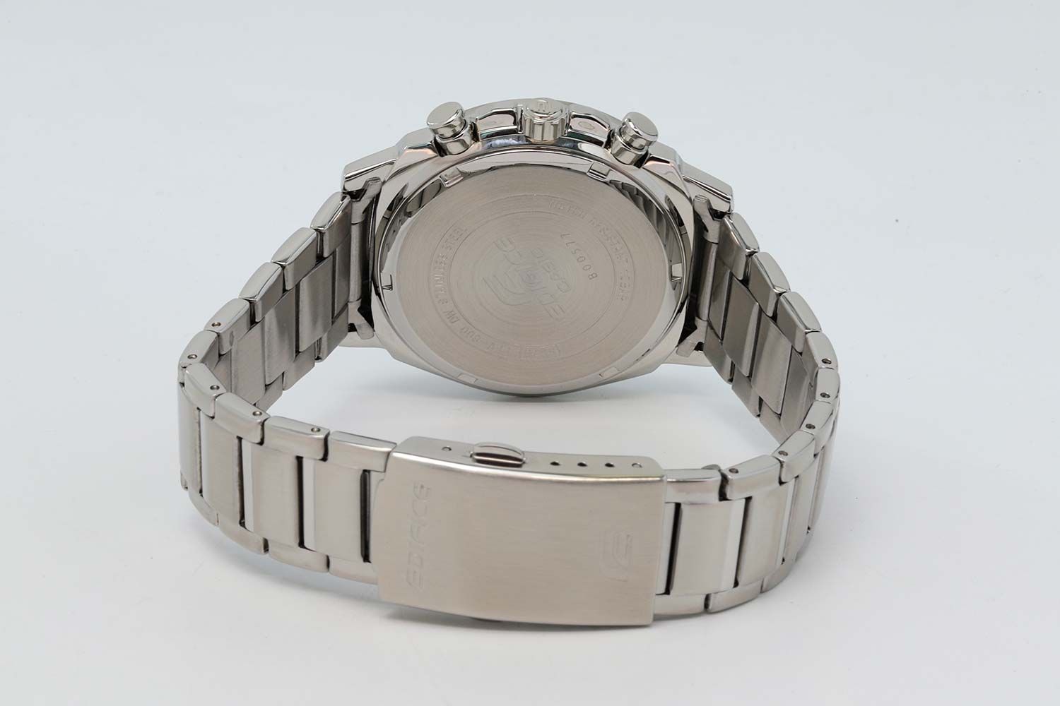 Мужские кварцевые аналоговые часы-хронограф с секундомером. Коллекция Edifice. Центральные часовая, минутная и секундная стрелки. Синий циферблат с часовыми метками в виде штрихов. Стрелки и метки с люминесцентным покрытием, которое светится в темноте после непродолжительного воздействия света. Окошко даты в позиции 4 ч. Секундомер с точностью показаний 1/10 с и временем измерения 60 мин. Режимы измерения: прошедшее время, промежуточное время, два финишных результата. Устойчивое к мелким механическим повреждениям минеральное стекло. Круглый корпус из нержавеющей стали с частичным покрытием чёрного цвета на безеле. Минутная шкала на безеле. Размер корпуса 43,8 мм на 49 мм, толщина 11,1 мм. Переводная головка с защитой. Завинчивающаяся задняя крышка. Стальной браслет с раскладывающейся застежкой. Батарейка рассчитана на 3 года. Водонепроницаемость WR100 (плавание и погружение без акваланга). Вес примерно 135 г.