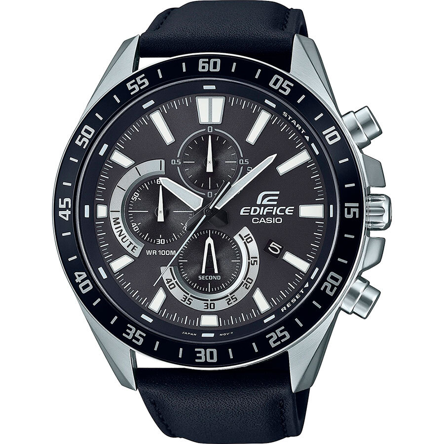 Мужские кварцевые аналоговые наручные часы-хронограф с секундомером. Серия Casio Edifice. Светонакопительное покрытие продолжает светиться в темноте даже после непродолжительного пребывания на свету. Окошко даты. Секундомер с точностью показаний 1с и временем измерения 60 мин. Завинчивающаяся задняя крышка. Круглый стальной корпус. Кожаный ремешок.