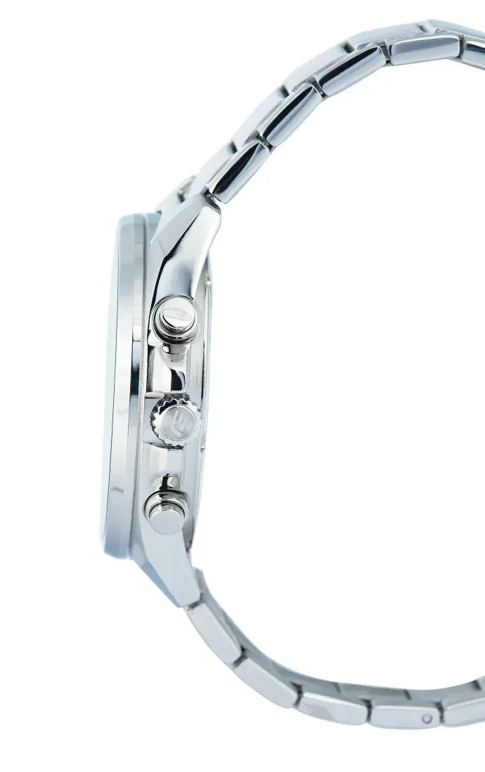 Мужские кварцевые аналоговые часы-хронограф с секундомером. Коллекция Edifice. Центральные часовая, минутная и секундная стрелки. Розовый циферблат с часовыми метками в виде штрихов. Стрелки и метки с люминесцентным покрытием, которое светится в темноте после непродолжительного воздействия света. Окошко даты в позиции между 4 и 5 ч. Секундомер с точностью показаний 1с и временем измерения 1ч. Режимы измерения: прошедшее время, промежуточное время, два финишных результата. 12-ти и 24-х часовой формат отображения времени (дополнительный малый циферблат в позиции 3 ч.). Устойчивое к мелким механическим повреждениям минеральное стекло. Круглый корпус из нержавеющей стали. Размер корпуса 43,5 мм на 48,6 мм, толщина 11 мм. Переводная головка с защитой. Завинчивающаяся задняя крышка. Стальной браслет с тройной раскладывающейся застежкой. Батарейка рассчитана на 2 года. Водонепроницаемость WR100 (плавание и погружение без акваланга). Вес около 128 г.