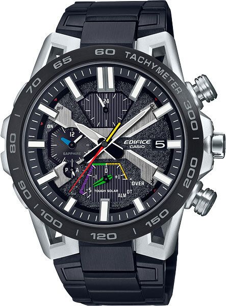 Мужские кварцевые аналоговые наручные часы -хронограф с секундомером и тахиметром. Серия Edifice Sospensione. Дизайн часов вдохновлен подвеской болида Формулы-1. Ушки часов разработаны по схеме четырехрычажной подвески гоночного автомобиля. Яркие акценты на циферблате напоминают цвета кнопок управления на рулевом колесе гоночного автомобиля. Питание от солнечной энергии (технология Tough Solar) - источником питания служит светочувствительная панель и аккумулятор, заряжаемый при попадании солнечного света на циферблат часов. Функция автоматического сохранения энергии. Индикатор низкого уровня заряда аккумулятора. Время работы аккумулятора без подзарядки приблизительно 5 месяцев, при включенной функции сохранения энергии приблизительно 19 месяцев. Чёрный циферблат с часовыми метками в виде штрихов. Центральные часовая, минутная и секундная стрелки. Стрелки и метки с люминесцентным покрытием, которое светится в темноте после непродолжительного воздействия света. Тахиметрическая шкала на безеле для расчета скорости на основании времени в пути. Секундомер с точностью показаний 1с и временем измерения 24ч. Режимы измерения: прошедшее время, время прохождения круга (части) дистанции. Память на 200 кругов. 12-ти и 24-х часовой формат отображения времени. Ежедневный будильник, ежечасный сигнал. Второй часовой пояс и мировое время, одновременное отображение текущего времени и времени в другом часовом поясе. Часы оснащены беспроводной технологией Bluetooth® со сверхнизким потреблением энергии для синхронизации со смартфоном. При подключении к смартфону часы автоматически корректируют текущее время и получают доступ к ряду полезных функций. Окошко даты в положении 3 ч. Функция поиска телефона. Устойчивое к мелким царапинам сапфировое стекло с антибликовым покрытием. Круглый стальной корпус с частичным покрытием чёрного цвета на безеле. Переводная головка с защитой. Стальной браслет с покрытием чёрного цвета, тройная раскладывающаяся застежка. Водонепроницаемость 100 WR (плавание с маской и трубкой). Вес около 170 г