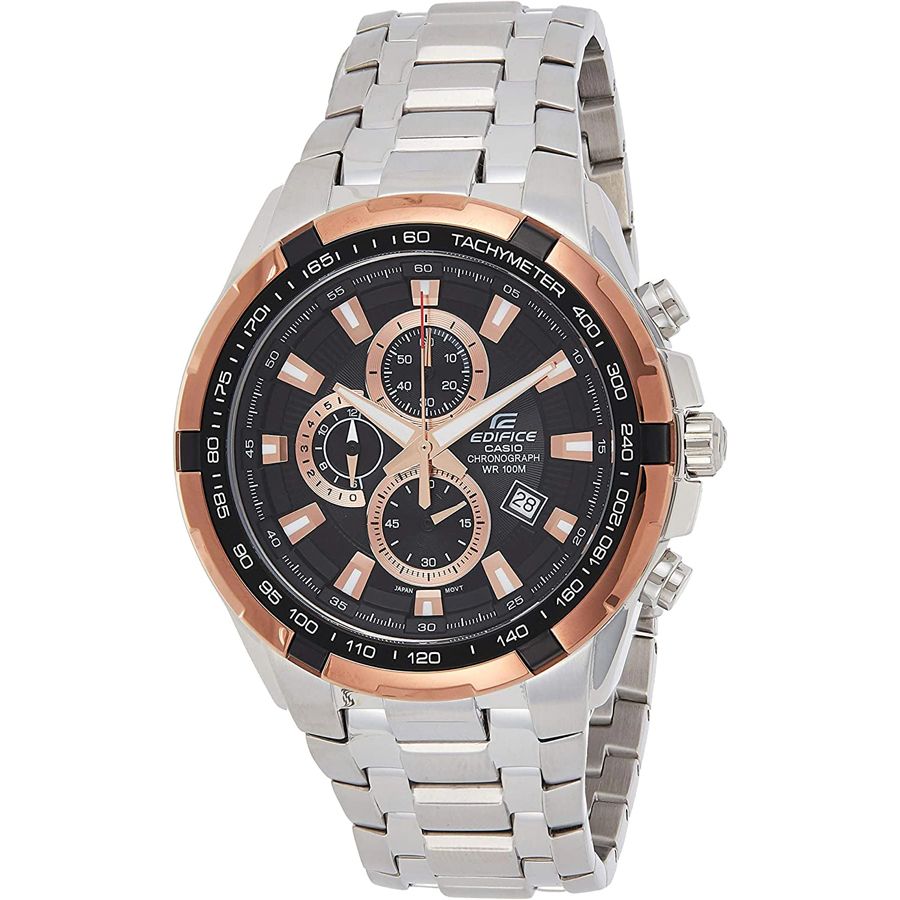 Мужские кварцевые аналоговые наручные часы-хронограф с секундомером и тахиметром. Серия Edifice. Центральные часовая и минутная стрелки. Секундная стрелка вынесена на отдельный малый циферблат в позиции 6 ч. Чёрный циферблат с часовыми метками в виде штрихов. Стрелки и метки с люминесцентным покрытием, которое светится в темноте после непродолжительного воздействия света. Окошко даты в положении 4 ч. Секундомер с точностью показаний 1с и временем измерения 12ч. Переводная головка с защитой. Тахиметрическая шкала на безеле для расчета скорости на основании времени в пути. Круглый стальной корпус с частичным покрытием цвета розового золота. Размер корпуса 53,5 мм на 48,5мм, толщина 11,5мм. Устойчивое к мелким механическим повреждениям минеральное стекло. Задняя крышка с винтовым фиксатором. Стальной браслет с раскладывающейся застежкой. Водозащита 100WR (плавание и ныряние без акваланга). Вес около 198 г.